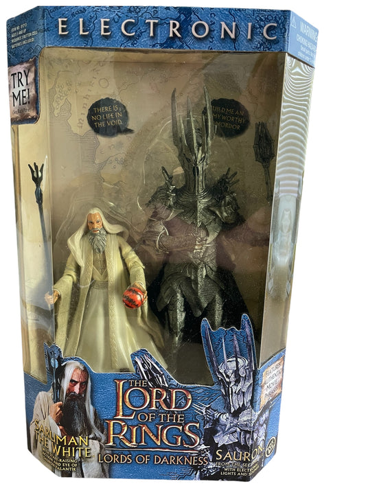 Vintage 2003 Lord Of The Rings - The Lords Of Darkness - Saruman The White & Sauron With Electronic Lights And Sounds Action Figure Set - Brand New Factory Sealed Shop Stock Room Find