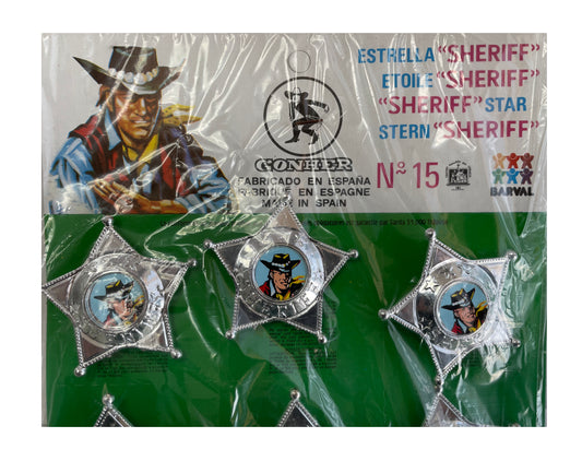 Vintage 1950's / 1960's Gonher / Barval Sheriff Star Pin Badge - Set Of 12 On Shop Display Card - Un Punched