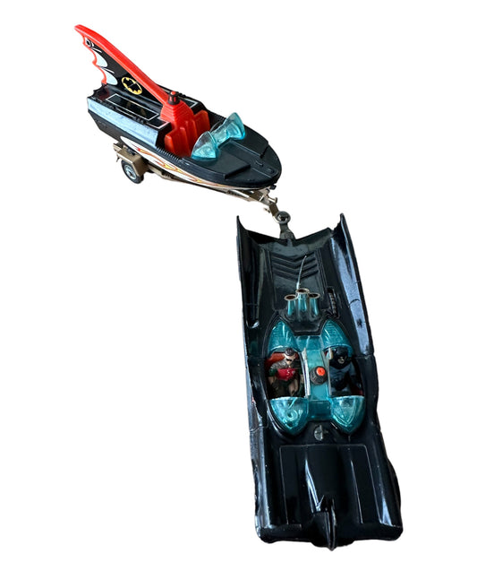 Vintage Corgi 1966 Rocket Firing Batmobile Die-cast Replica Vehicle With Batman And Robin Figures Plus The Batboat And Trailer - Very good Condition