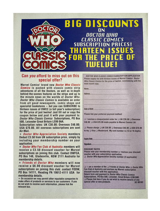 Vintage 1993 Marvels Doctor Dr Who Classic Comics Full Colour Issue 13 Comic 10th November 1993 - Brand New Shop Stock Room Find
