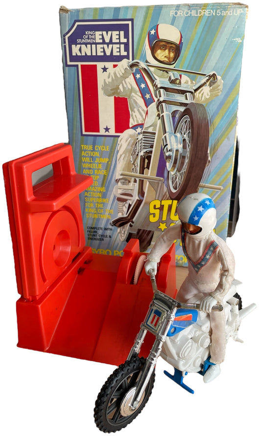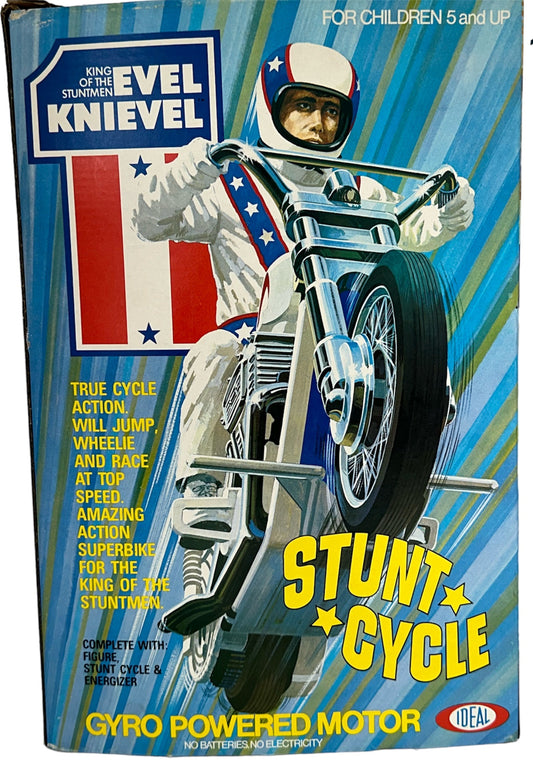 Vintage Ideal 1973 Evel Knievel King Of The Stuntmen Stunt Cycle Bike Complete With Evel Knievel Figure And Gyro Energizer - Mint In Box - Unsold Shop Stock