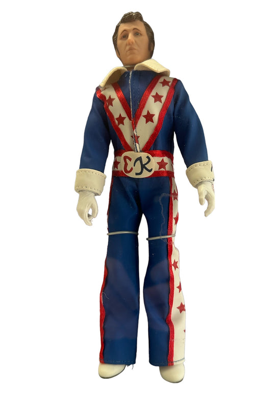 Vintage 2012 Evel Knievel 12-Inch Action Figure Americas Daredevil Dressed In Blue Jumpsuit & Complete With Cane & Mini Graphic Poster - Factory Sealed Shop Stock Room Find