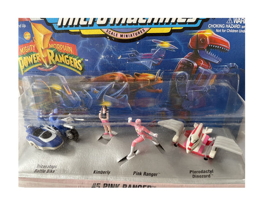 Vintage 1994 Mighty Morphin Power Rangers Micro Machines Miniature The Pink Ranger Set No. 5 - Includes The Pink Ranger Figure, Kimberly Figure, Pterodactyl Dinozord and The Triceratops Battle Bike With The Blue Ranger - Unsold Shop Stock Room Find