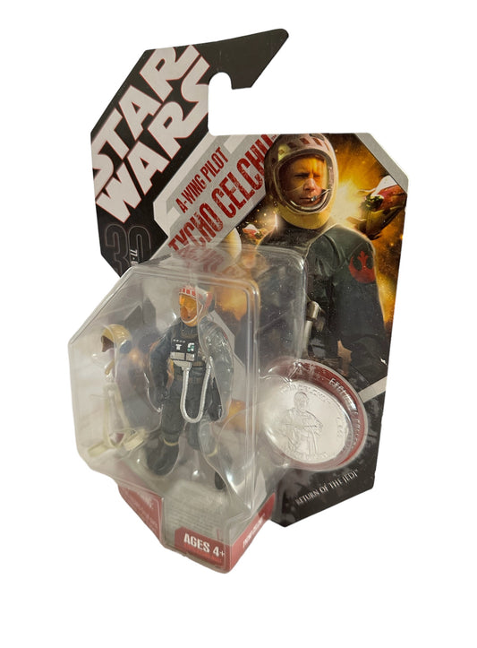 Vintage 2007 Star Wars 30th Anniversary Collection A-Wing Pilot Tycho Celchu Action Figure With Exclusive Collectors Coin No. 44 - Brand New Factory Sealed Shop Stock Room Find