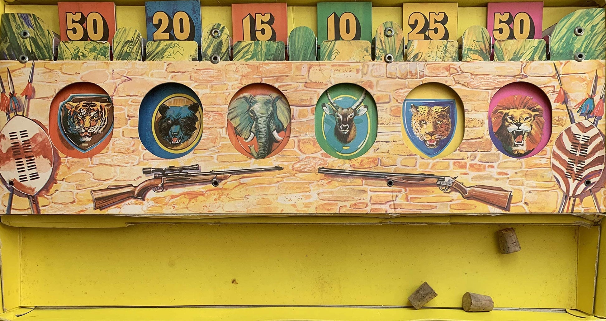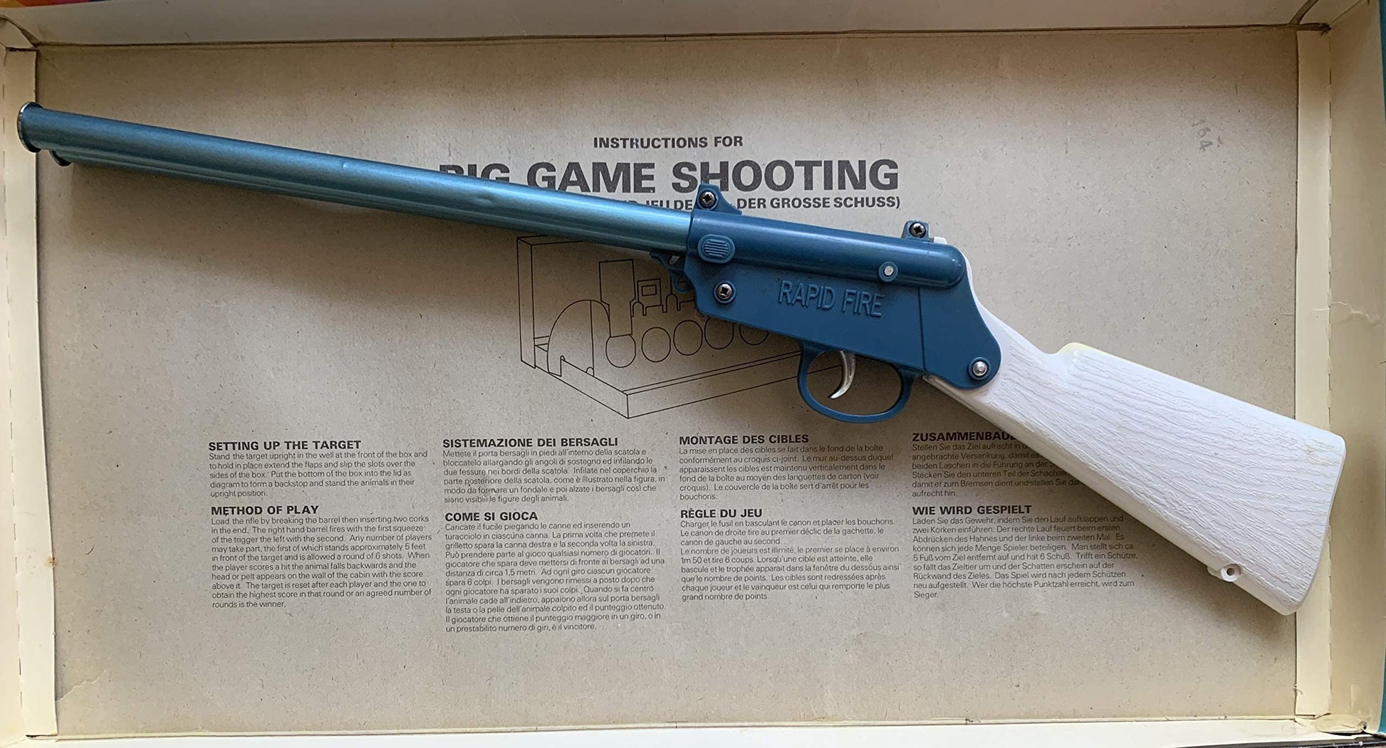 Vintage 1970s Chad Valley Big Game Wild Animal Target Shooting Game - In The Original Box. Released by Chad Valley in the 1970's as part of their series of toy shooting games. This fantastic Big Game Wild Animal Shooting Game is suitable for in door or outdoors, and includes A Target Rail with 6 different big game animals, each with different scores, A Double Barrel Cork Shooting Repeater Rifle, 10 x corks and the Instructions which are printed on the inside of the box lid. Load the rifle by breaking the barrel then inserting two corks in the end. The right hand barrel fires with the first squeeze of the trigger, the left with the second. Any number of players may take part, the first of which stands approximately 5 feet in front of the target and is allowed 6 shots. When the player scores a hit, the animal falls backwards and the head or pelt appears on the wall of the cabin with the score above it. The target is reset after each player and the one to obtain the highest score in the round or an agreed number of rounds is the winner. Fantastic Condition shooting game, however I can only get one side of the rifle to fire, so does need a little attention, but otherwise its in very good order. Comes in the original box which is also in very good condition for its age, however it does have some wear, which is mainly along the edges and some tape repairs to the corners of the lid. A truly fantastic vintage Chad Valley Big Game Target Shooting Game from over 40 years odd ago. All Orders Received Before 4.00pm Mondays to Fridays are shipped the same day