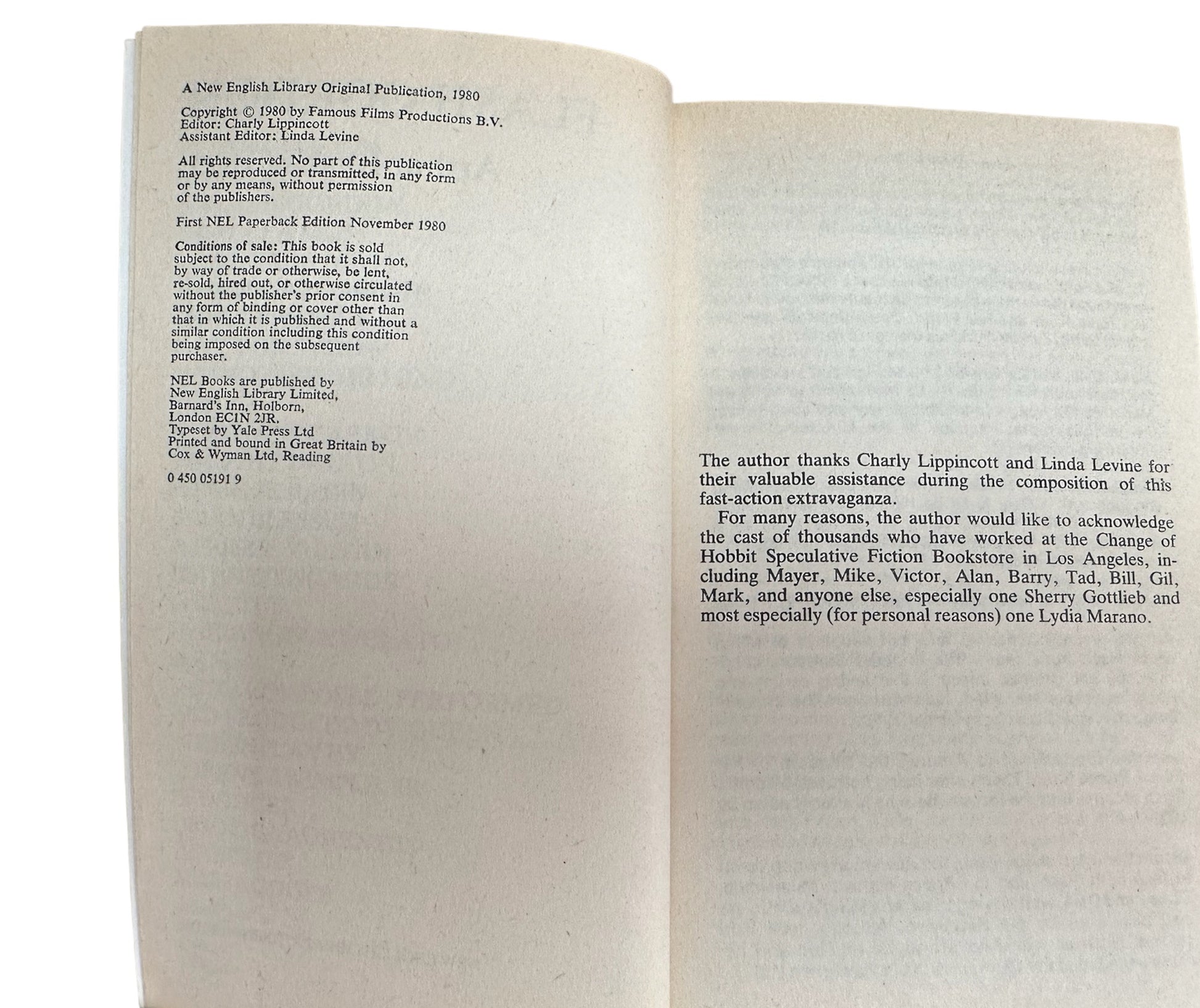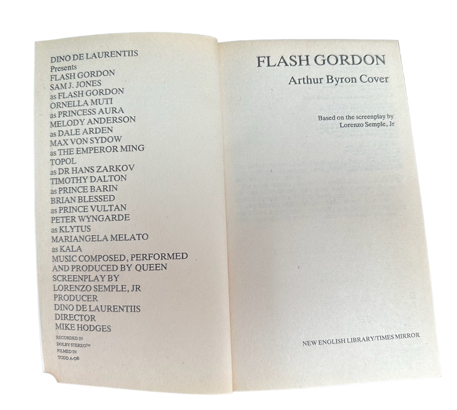 Vintage 1980 Flash Gordan The Paperback Novel Of The Blockbuster Movie - Shop Stock Room Find. Released in 1980 by New English Library and as the novel of the blockbuster movie. Ming the Merciless! He rules the planet Mongo with cold terror - and if he has his Imperial way, will conquer the entire universe! But first the king of Mongo must destroy Flash Gordon, the fair-haired earthling and Superbowl star, destined to challenge his sinister forces... together with Doctor Zarkov and the beautiful Dale Arden, Flash is sent hurdling through interstellar space to the Towers of Mingo City, the heartless armies of the all-seeing secret police, and the deadly creatures and half-human beings lurking in Ming's lair. There, the space hero has a triple-task: survive Ming's onslaught, free his own friends, and save - billions of light years away - the planet Earth! This fantastic Flash Gordan Paperback Book is 188 pages and based on he screenplay by Lorenzo Semple Jr and features the Arthur Byron Cover, as well as 8 pages of glossy stills taken from the movie. Former Shop Stock From A closed Down Comic Book Shop. Some very minor signs of shelf wear on the edge tips, but otherwise perfect. All Orders received before 4.00pm Mondays to Fridays are dispatched the same day