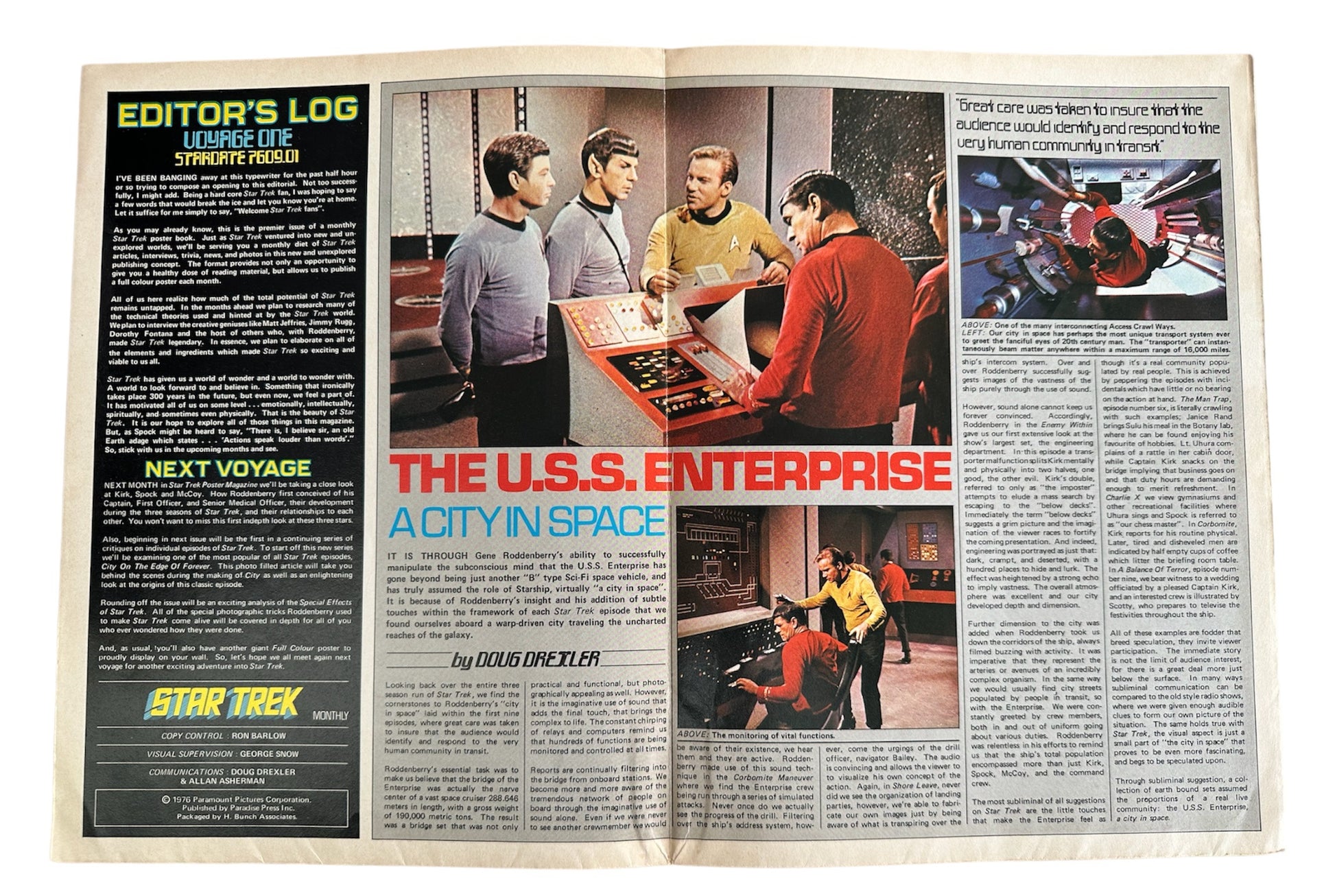 Vintage 1976 Star Trek The Original Series Giant Poster Book Voyage One Stardate 7609.01 Special Collectors Issue. Released by Paradise Press Inc in 1976 and was the very first issue, issue number one dated September 01 1976. This fantastic Giant Poster Book includes articles and features all from the original series with this issue featuring - Spock The Evolution, The USS Enterprise A City In Space and The Cage A Star Trek Film We Never Saw, with the pages opening up to reveal a giant poster of The USS Enterprise inside the Tholian Web and measures 34 inches by 22 inches. The Giant Poster Book is in very good condition over all which is amazing considering it is now over 47 years old, it does have some minor splitting on one of the creases, and some minor wear on the corners, but otherwise is a fantastic example of a very rare vintage Star Trek Giant Poster Book fantastic first issue from 1976. All Orders Received Before 4.00pm Mondays to Fridays are shipped the same day