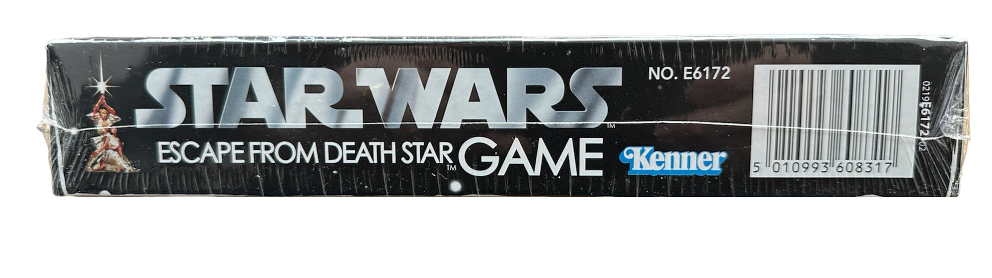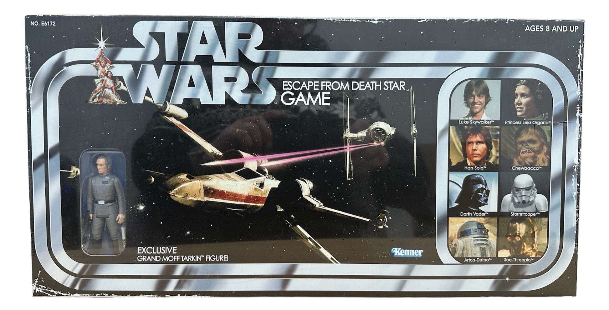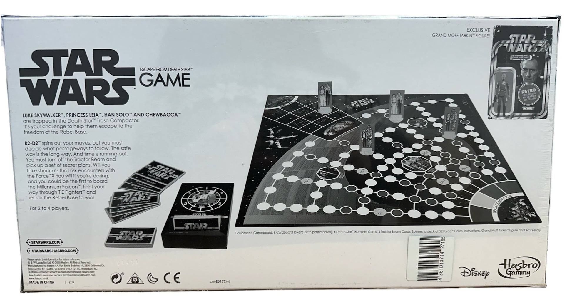 Star Wars Escape From The Death Star Board Game With Exclusive Grand Moff Tarkin Action Figure - Brand New Factory Sealed. Produced by Hasbro and is based on the original Kenner Escape From The Death Star game from 1977. this fantastic retro board game contains 8 Cardboard Playing Tokens With Plastic Bases, 4 Death Star Blueprint Cards, 4 Tractor Beam Cards, R2D2 Spinner and a Deck Of 52 Force Cards, Instructions and an exclusive Grand Moff Tarkin Action Figure. Luke Skywalker, Princess Leia, Han Solo and Chewbacca are trapped in the Death Star Trash Compactor. It's your challenge to help them escape to the freedom of the Rebel Base. R2-D2 spins out your moves, but you must decide what passageways to follow. The safe way is the long way. And time is running out. You must turn of the Tractor Beam and pick up a set of secret plans. Will you take short cuts that risk encounters with the Force? You will if you're daring, and could be the first to board the Millennium Falcon, fight your way through the Tie Fighters and reach the Rebel Base to win. For 2 to 4 Players. Brand New Factory Sealed. All Orders Received Before 4.00pm Mondays to Fridays are shipped the same day.