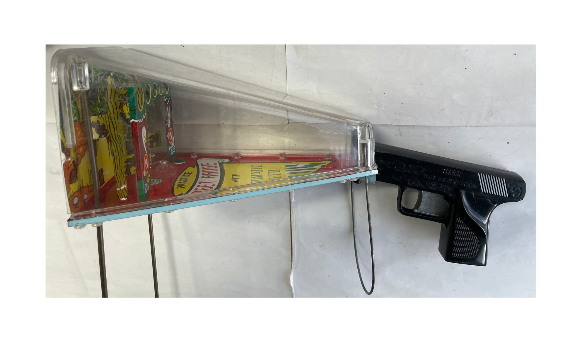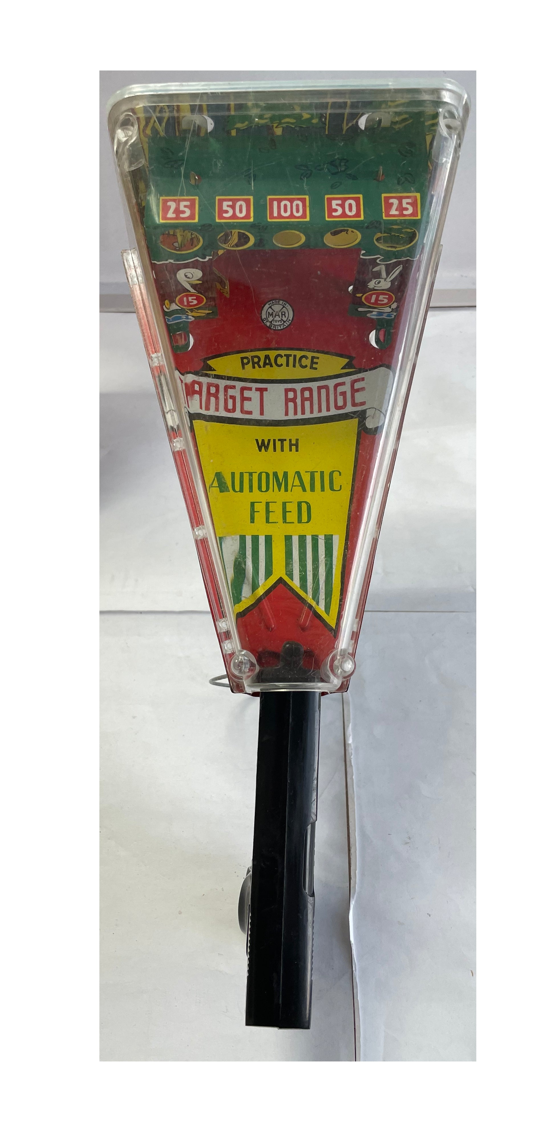 Vintage 1950'S Louis Marx Toys - Practice Target Range Game - Fantastic Full Working Condition - In The Original Box. Released by Louis Marx Toys in the 1950's as part of their series of Target Range Games. This fantastic Target Range Game is a shooting gallery game that is completely enclosed in the case. The pistol fires small balls at the targets which show the scores for a perfect hit, and some of the targets spin when hit. Features automatic feed and reload. The game is in very good condition over all which is amazing considering it is nearly 70 years old, it is 100% complete including both front and back legs, and in full working condition. Comes in the original box, which is also in fantastic condition with only some very very minor signs of wear on the tips of the corner edges. A truly wonderful vintage game from yesteryear. All orders received before 4.00pm Monday to Fridays are shipped the same day