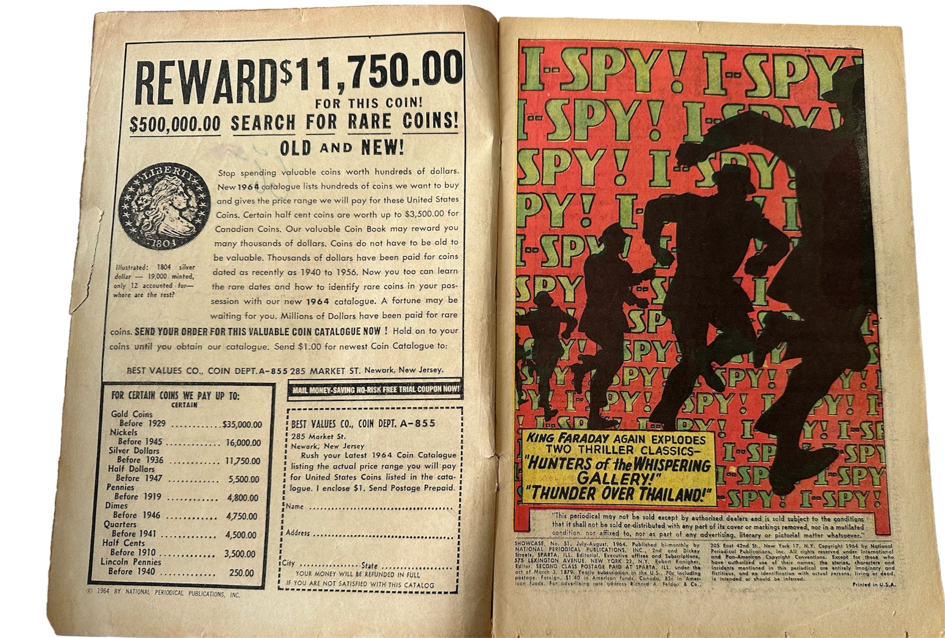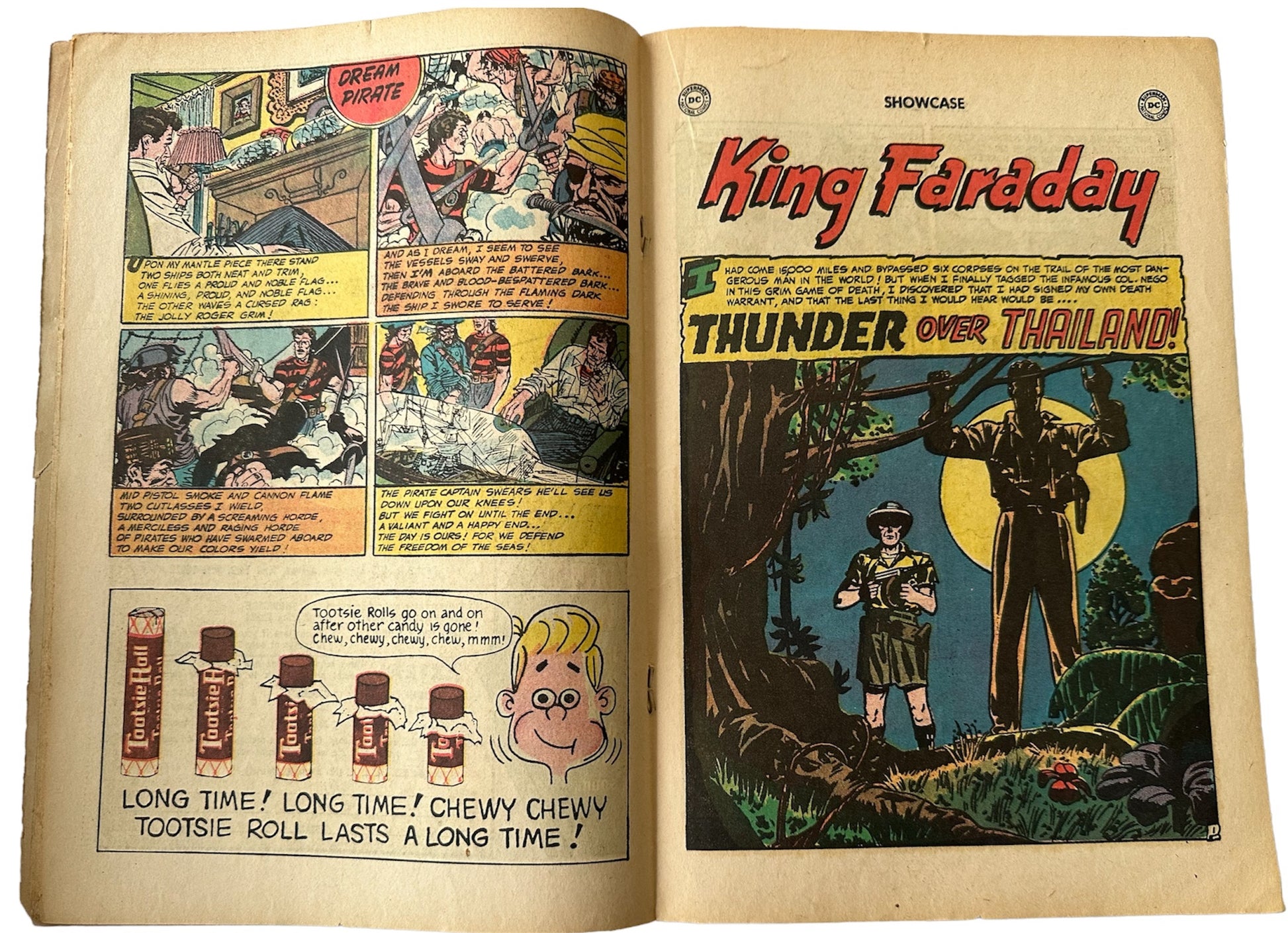 Vintage 1964 DC - Showcase Presents Comic Issue Number 51 - The Maniaks - Good Condition Vintage Comic. Released by DC in August 1964 and is issue number 51 in the Showcase Presents series of comics. This fantastic issue of Showcase Presents Comic is issue number 51 with 36 pages of features that includes two full colour strip stories featuring King Faraday in Hunters Of The Whispering Gallery and Thunder Over Thailand, plus much more. Comes Bagged and boarded. Former shop stock from a closed down Toy & Comic Shop. Some signs of wear on the edges and a few minor creases, but otherwise very good. All Orders received before 4.00pm Mondays to Fridays are dispatched the same day.