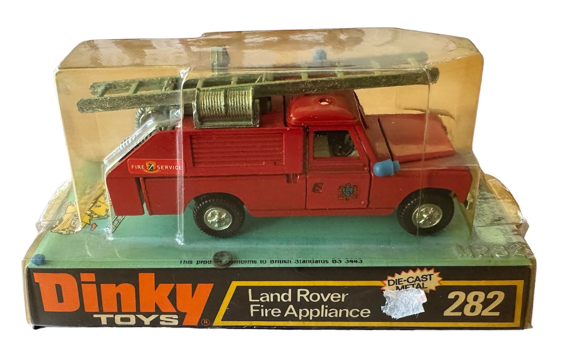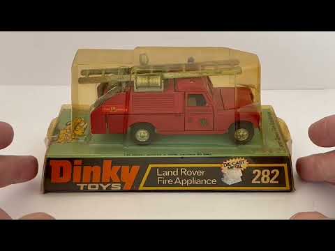 Vintage 1973 Dinky Toys No. 282 Land Rover Fire Appliance Truck Diecast Metal Replica Vehicle Model - Shop Stock Room Find. Released by Dinky Toys in or around 1973, as part of there series of fire vehicle Die-cast models, and is Dinky Model Number 282. This fantastic Fire Appliance Diecast Metal Replica Vehicle Model is finished with a Red die-cast bodywork with silver trim, it is a 1/43 scale model that measures 4 1/2 inches long and the features include opening front doors and free rolling wheels. Shop Stock Room Find. Discovered in the store room of a closed down shop with a whole host of other Dinky Toys from a similar era. Unopened, and still attached to the display plinth with the plastic cover still taped closed.