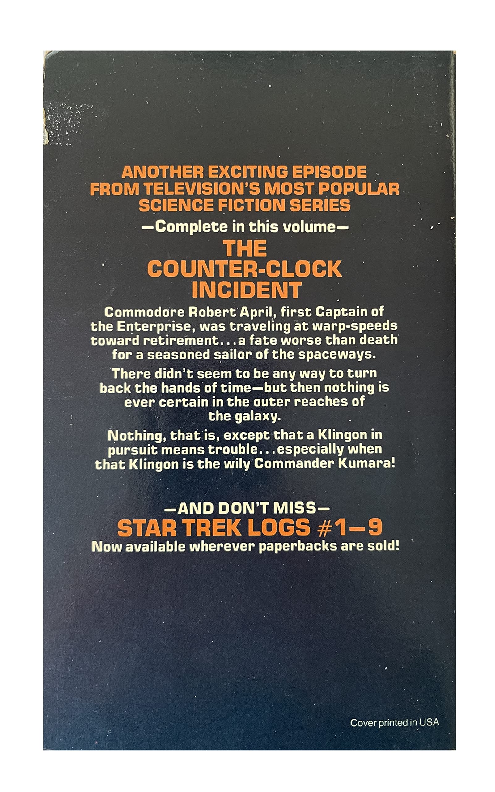 Vintage 1978 Star Trek Log Seven - Adapted From The Animated TV Series - Paperback Book - By Alan Dean Foster. Released by Balentine Books in 1978 and is the Sevenh in the series of the Log Books adapted from the Animated TV series. This fantastic Log Seven book includes an adaption of an episode that featured in the animated series entitled - The Counter-Clock Incident - Commodore Robert April, first Captain of the Enterprise, was traveling at warp-speeds toward retirement... a fate worse then death for a seasoned sailor of the spaceways. There didn't seem to be any way to turn back the hands of time - but then nothing is ever certain in the outer reaches of the galaxy. Nothing that is except that a Klingon in pursuit means trouble... especially when that Klingon is the wily Commander Kumara. To make matters worse, when the Enterprise enters a negative universe, the crew age backwards, which leaves its fate and command to the former captain. The book is in very good condition over all, which is amazing considering it is now almost 44 years old. The front and back covers are nice clean and bright with only but does have some signs of shelf wear which is mainly along the edges. The spline is also in very good condition again with only minor signs of wear along the edges. Internally the book is in very good condition, all 184 pages are present and attached, they are clean and bright without any signs of damage or markings on any page, with the exception of some minor age sports on a few of the pages. A truly fantastic example of a very rare vintage Star Trek book from 1978. All orders received before 4.00pm Monday to Fridays are shipped the same day