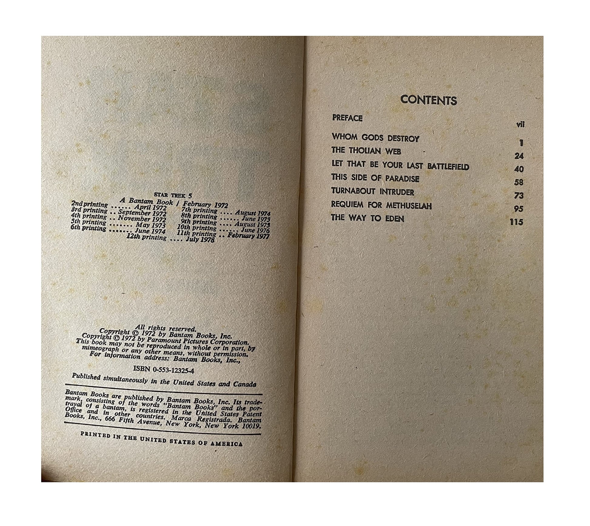 Vintage 1978 Star Trek 5 - Adapted From The Original Television Series - Paperback Book - By James Blish. Released by Bantam Books in 1978 and is the fifth in the series of the Star Trek Books adapted from the Original Television series scripts. This fantastic Star Trek 5 book includes seven adaptions of episodes that featured in the original TV series including - Whom Gods Destroy, Let That Be Your Last Battlefield, The Tholian Web, This Side Of Paradise, Turnabout Intruder, Requiem for Methuselah, and The Way to Eden. The book is in very good condition over all, which is amazing considering it is now almost 44 years old. The front and back covers are nice clean and bright but does have some minor wear which is mainly along the edges. The spline is also in fantastic condition with only minor signs of wear on the tips of the top and bottom edges. Internally the book is in fantastic condition, all 136 pages are present and attached, they are clean and bright without any signs of damage or markings on any page, with the exception of some minor age sports on a few of the pages. A truly fantastic example of a very rare vintage Star Trek book from 1978. All orders received before 4.00pm Monday to Fridays are shipped the same day