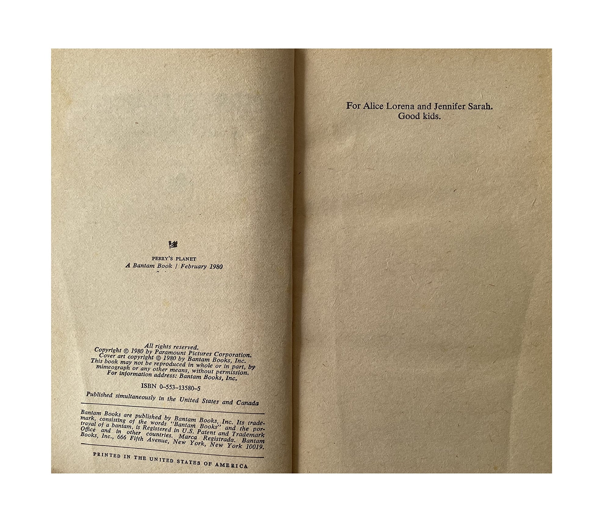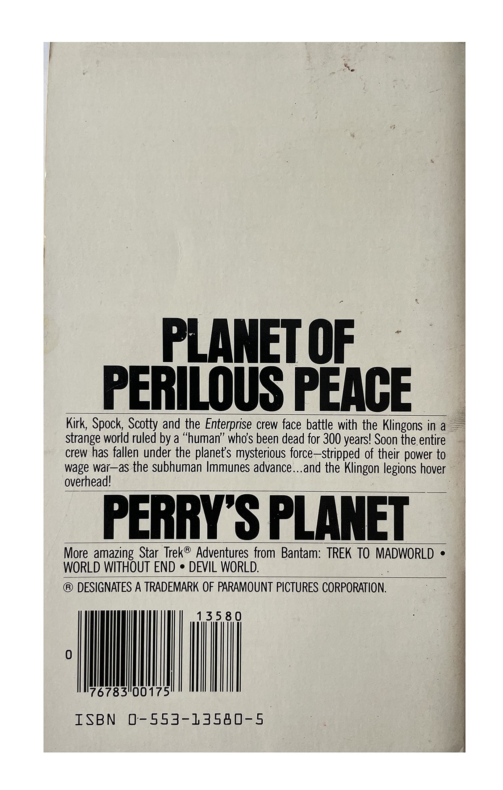 Vintage 1980 A New Star Trek Experience - Perry's Planet - Paperback Book - By Jack C. Haldeman II. Released by Bantam Books in 1980- as part of their New Star Trek Experience series of books. Kirk, Spock, Scotty and the Enterprise crew face battle with the Klingons in a strange world ruled by a "human" who's been dead for 300 years! Soon the entire crew has fallen under the planet's mysterious force—stripped of their power to wage war—as the subhuman Immunes advance… and the Klingon legions hover overhead!. The book is in very good condition over all, which is amazing considering it is now almost 42 years old. The front and back covers are nice clean and bright with only some very very minor signs of any wear on the tips of the edges edges. The spline is also in fantastic condition with only minor signs of wear on the edges. Internally the book is in fantastic condition, all 134 pages are present and attached, they are clean and bright without any signs of damage or markings on any page, with the exception of some minor age sports on a few of the pages. A truly fantastic example of a very rare vintage Star Trek book from 1979. All orders received before 4.00pm Monday to Fridays are shipped the same day