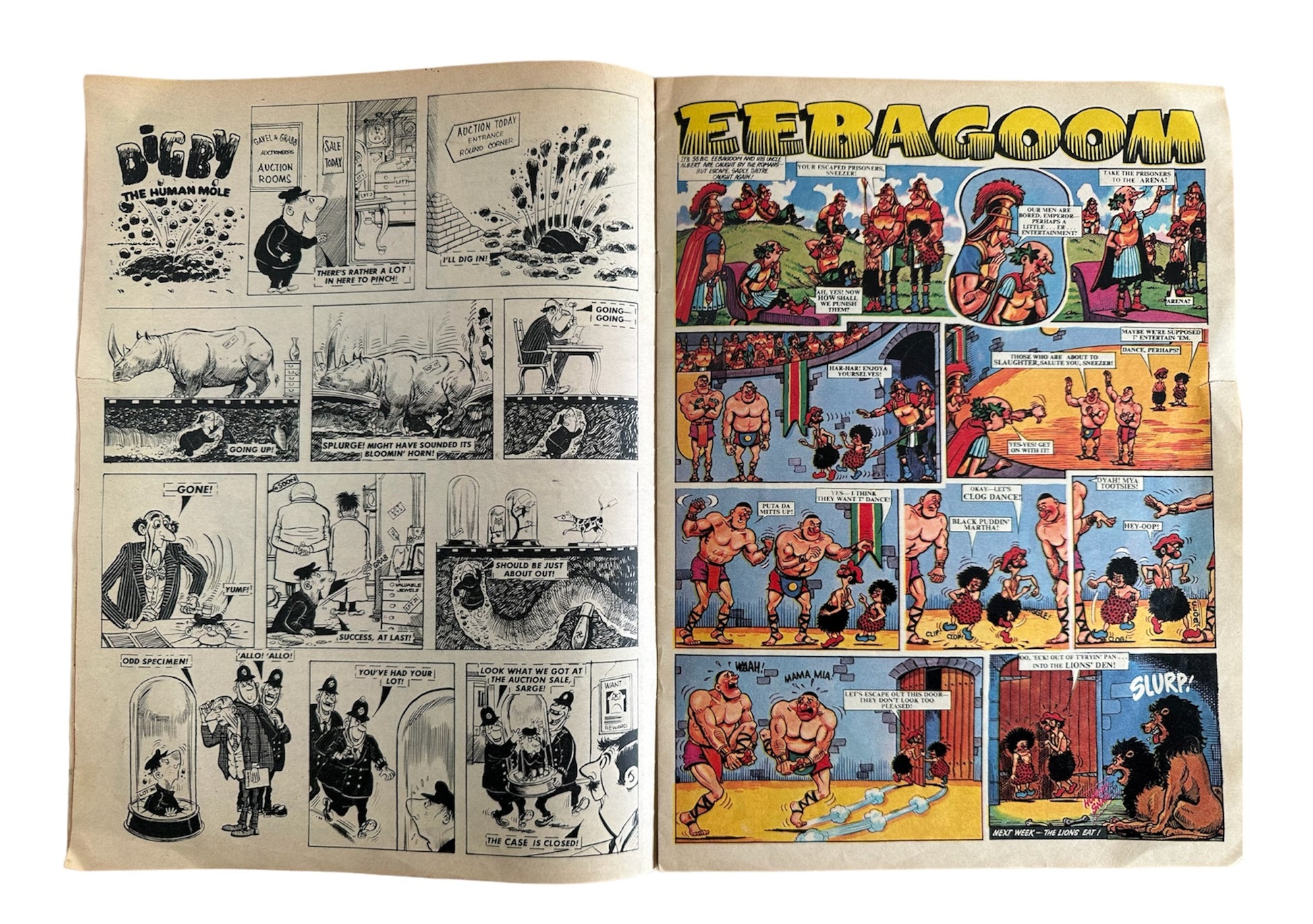 Vintage 1977 Plug Comic Issue No. 4 Very Very Rare. Released by DC Thompson on October 4th 1977 and is issue number 4 in the weekly Comic series. This fantastic Plug comic is Issue Number 4 in the series and was a weekly comic which ran from September 77 to September 79 before being axed. The Comic includes colour and black and white comic strip stories including Tony Jackpot, The Games Gang, Digby The Human Mole, Eebagoom, Ava Banana nad much much more. The comic is in very good condition, which is amazing considering its now over 47 years old, with only some minor signs of wear on the edges and a few minor tears. Comes bagged and boarded. Very Very Rare issue. All Orders received before 4.00pm Mondays to Fridays are dispatched the same day.