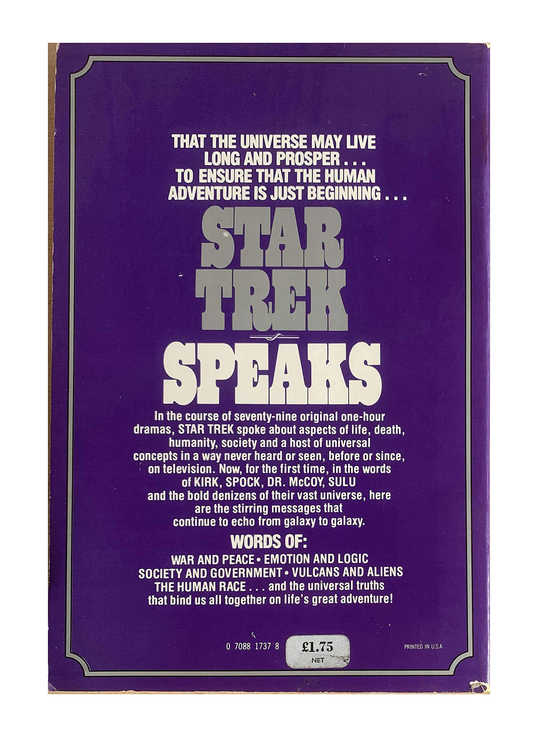 Vintage 1979 Star Trek Speaks - Large Paperback Book by Susan Sackett, Fred Goldstein and Stan Goldstein. Released by Pocket Books in 1979 with this being the first Issue of the paperback which is culled directly from the scripts of the Original Series. In the course of seventy nine original one hour dramas, Star Trek spoke about aspects of life, death, humanity, society and a host of universal concepts in a way never heard or seen, before or since, on television. Now, for the first time, in the words of Kirk, Spock, McCoy, Sulu and the bold denizens of their vast universe, here are the stirring messages that continue to echo from galaxy to galaxy. Words Of - War And Peace, Emotion And Logic, Society And Government, Vulcans And Aliens, The Human Race - and the universal truths that bind us all together on life's great adventure! Very good copy of a vintage paperback book from 42 years ago. The front and back covers are nice and clean and bright with only some very minor signs of wear along the edges. The spline is also in very good condition, again with only some very minor signs of wear along the edges. Internally the book is in very good condition, all 160 pages are present and attached, they are clean and bright with out and signs of damage or wear or markings on any page. A truly fantastic find of a vintage book from yesteryear. All orders received before 4.00pm Monday to Fridays are shipped the same day