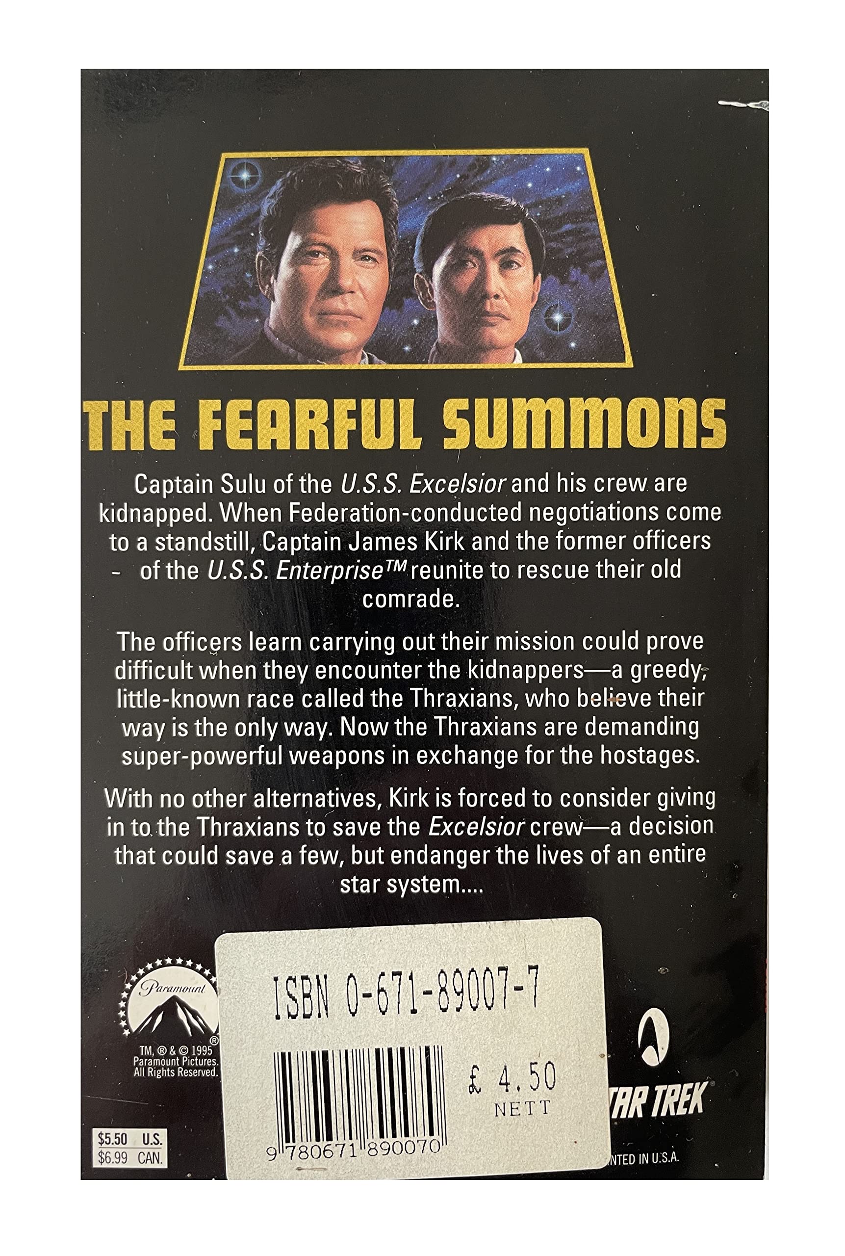 Vintage 1995 Star Trek Novel - The Fearful Summons - Paperback Book - By Howard Weinstein - Shop Stock Room Find. Released by Pocket Books in 1995 and is based on the Star Trek The Original Series television program. Captain Sulu of the USS Excelsior and his crew are kidnapped. When Federation-conducted negotiations come to a standstill, Captain James Kirk and the former officers of the USS Enterprise reunite to rescue their old comrade. The officers learn carrying out their mission could prove difficult when they encounter the kidnappers – a greedy little-known race called the Thraxians, who believe their way is the only way. Now the Thraxians are demanding super-powerful weapons in exchange for the hostages. With no other alternatives, Kirk is forced to consider giving in to the Thraxians to save the Excelsior crew – a decision that could save a few, but endanger the lives of an entire star system. Shop Stock Room Find. Discovered in the stock room of a closed down shop with a whole host of other books and annuals from a similar era. some minor signs of shelf wear on the edges and and some page browning inside the front cover due to age. All orders received before 4.00pm Monday to Fridays are shipped the same day
