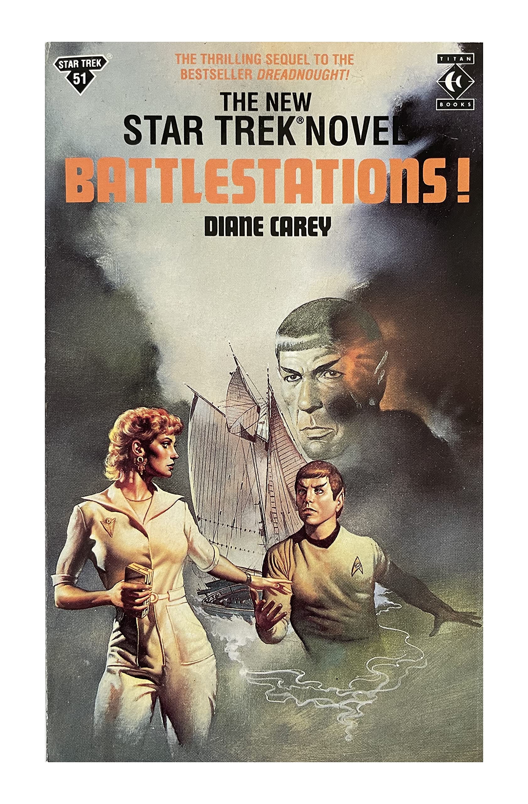 Vintage 1991 The New Star Trek Novel - Battleststions! - Paperback Book - By Diane Carey - Shop Stock Room Find. Released by Titan Books in 1991 and is based on the Star Trek The Original Series television program. Back on Earth enjoying a well-deserved shore leave, Captain Kirk is rudely accosted by a trio of Starfleet security guards. It seems he is wanted for questioning in connection with the theft of transwarp – the Federation's newest, most advanced propulsion system. Could Captain Kirk, Starfleet's most decorated hero, be guilty of stealing top-secret technology? With the aid of Mr. Spock, Lt. Cmdr. Piper begins a desperate search for the scientists who developed transwarp – a search that leads her to an isolated planet, where she discovers the real – and very dangerous – traitor! Shop Stock Room Find. Discovered in the stock room of a closed down shop with a whole host of other books and annuals from a similar era. All orders received before 4.00pm Monday to Fridays are shipped the same day