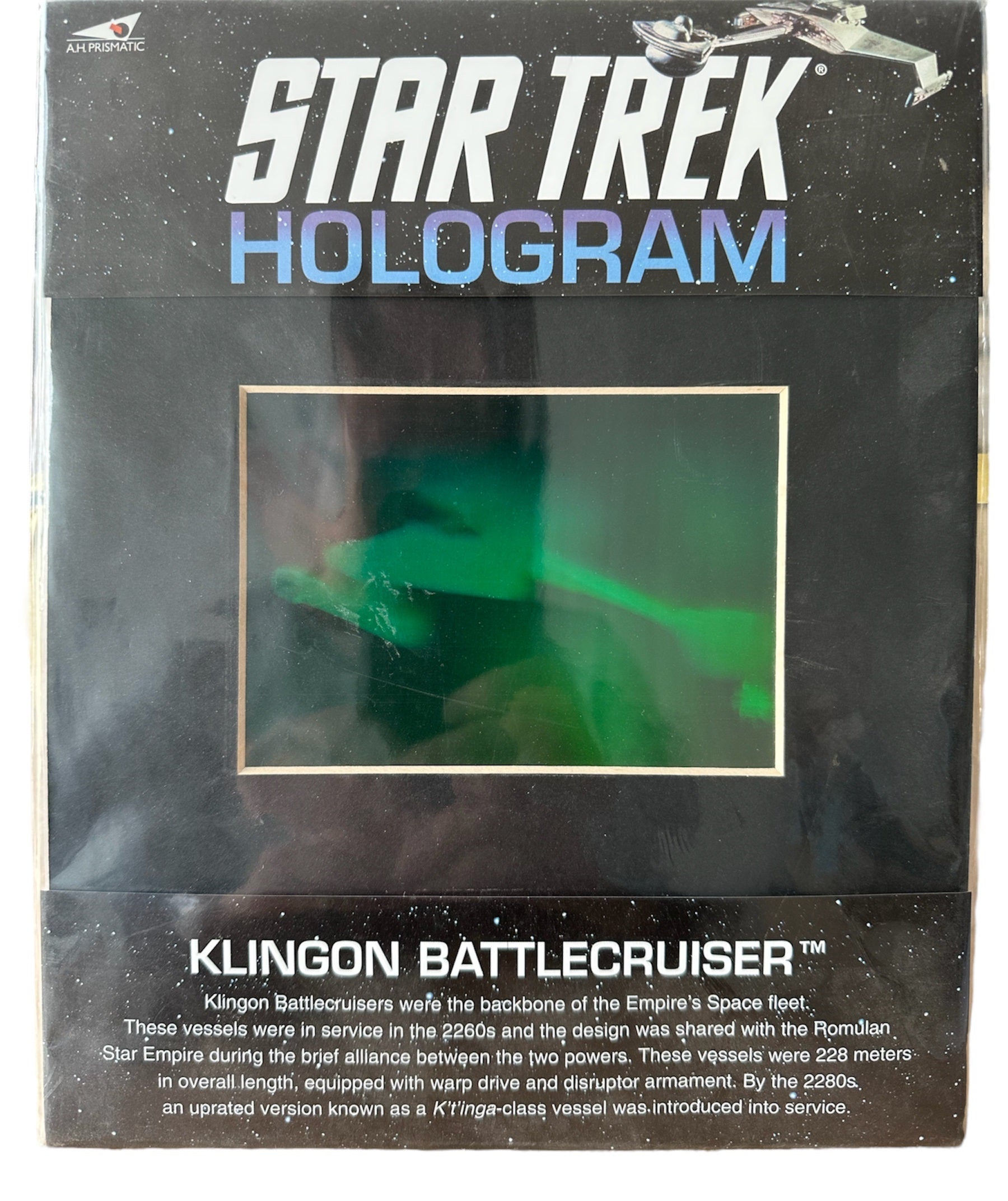 Vintage 1991 Star Trek The Original Series Klingon Battlecruiser Hologram - Brand New Shop Stock Room Find. Released by A.H Prismatic in 1991 as part of their series of Star Trek Hologram series. This fantastic Star Trek The Original Series Hologram features the Klingon Battlecruiser and measures 25cms by 20cms with a green image of the incredible ship, and gives a brief history on Klingon Battlecruisers as well as Star Trek and what a Hologram is and how it is made. Brand New Factory Sealed Shop Stock Room Find. Discovered in the store room of a closed down shop with a whole host of other items from a similar era. All Orders Received Before 4.00pm Mondays to Fridays are shipped the same day.