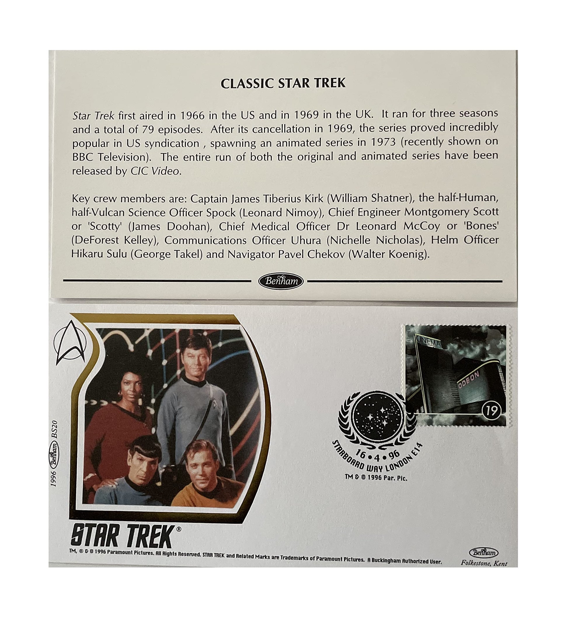 Vintage 1996 The Original Series First Day Postal Cover Stamp No. BS20 Dated 16 4 96 Star Starboard Way London E14 - Brand New Shop Stock Room Find. Released by Benham in 1996 as part of their series of first day covers. This fantastic first day cover features the crew of the USS Enterprise NCC-1701 Star Ship attached to the envelope featuring the Starfleet Logo and a stamp and bears the mark Star Starboard Way London E14 16.4.96, and is numbered BS20 includes the certificate inside the envelope and was limited to only 5000 pieces worldwide. Brand New Shop Stock Room Find. Discovered in the stock room of a closed down toy and comic shop with a whole host of other Stamp Sets from a similar era. All Orders Received Before 4.00pm Mondays to Fridays are shipped the same day