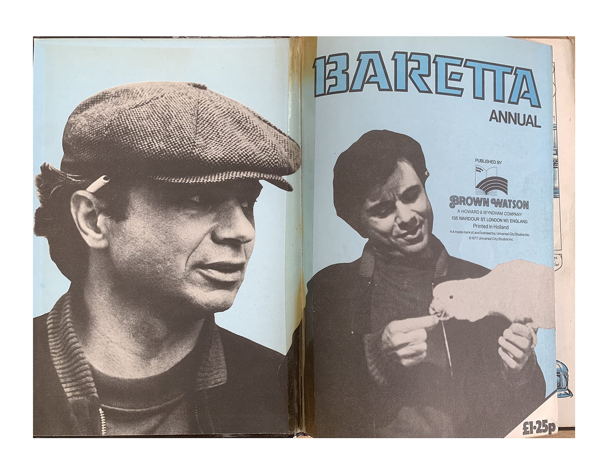 Vintage Baretta Annual 1978. Released by Brown Watson in late 1977 for the upcoming 1978 year. This fantastic Baretta Annual features original stories, strip stories, features, information, and articles and is based on the highly popular TV series of the time. This annual is in fairly good condition for its age, which is amazing considering that it is now 43 years old. The front and back covers are nice and bright, but does have some wear on the edges. The spline is also in fairly good condition but has lost some of its paper covering at the bottom and has had some clear tape repair. Internally the book is also in fairly good condition, all 62 pages are present and attached, they are bright and clean and without any form of writing or damage on any page, other than at some point in its life, the block of pages had become separated from the spline, however this has neatly been repaired with clear tape. Despite its faults, it is still A very nice example of a vintage Baretta Annual from yesteryear. All orders received before 4.00pm Monday to Fridays are shipped the same day