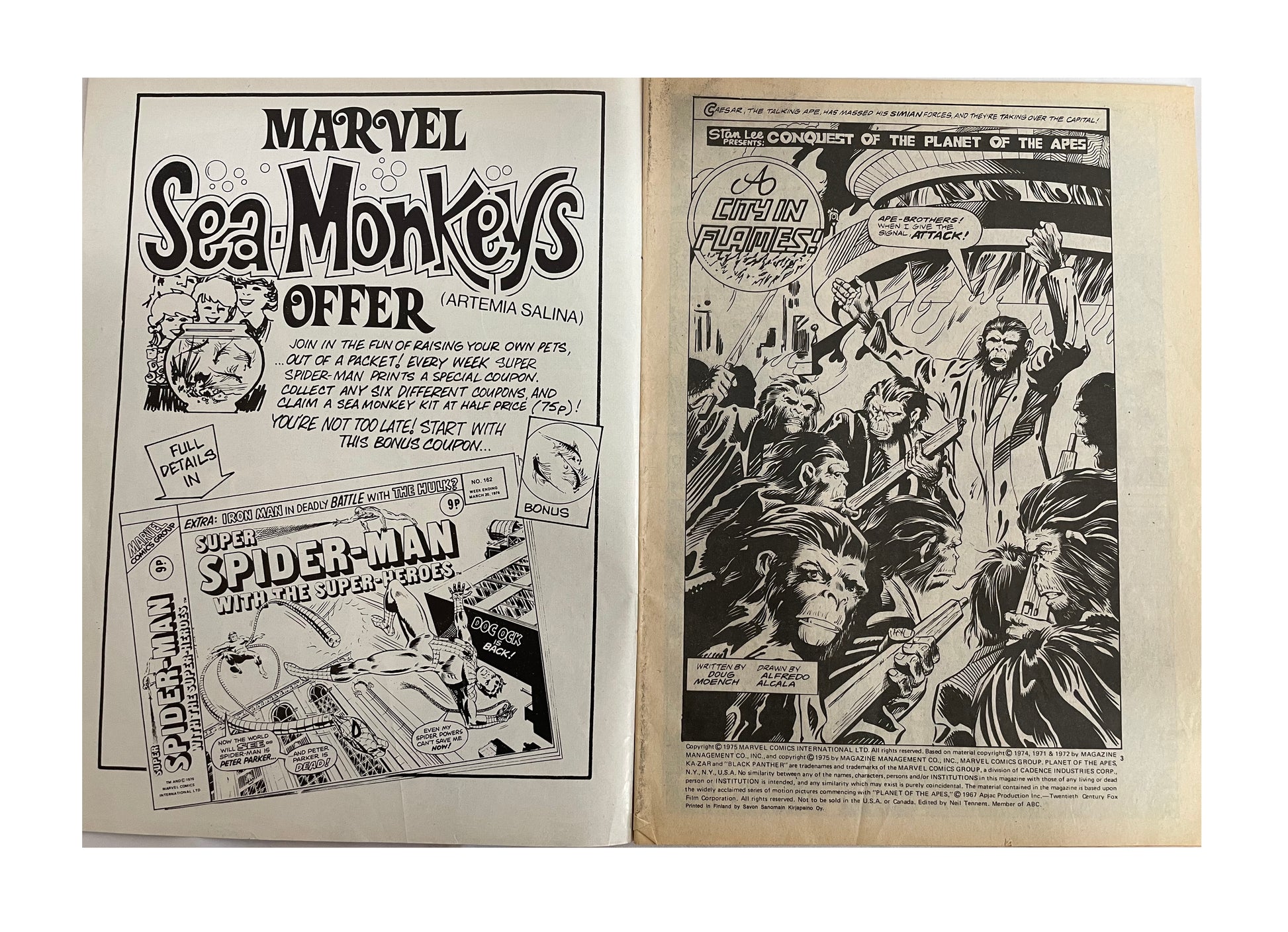 Vintage 1976 Marvels Comics - Planet Of The Apes Comic Issue No. 74 - March 20th 1976 - Former Shop Stock. Released by Marvels Comics on March 20th 1976 and is issue number 74 of this long running comic that was based on the 1970's movies. The comic features the final part adaptation of the movie Conquest Of The Planet Of The Apes and is entitled City In Flames. Also includes comic strips featuring Ka-Zar, and The Black Panther. Very Good Condition vintage comic, but does have a name and number wrote on the cover, and a few minor marks where something has been stood on the comic, and some very very minor signs of browning to a few of the page edges, due to age and the type of paper that was used back in the day. Former Shop Stock of a closed down Toy & Comic Shop. Comes bagged and boarded. All Orders received before 4.00pm Mondays to Fridays are dispatched the same day.