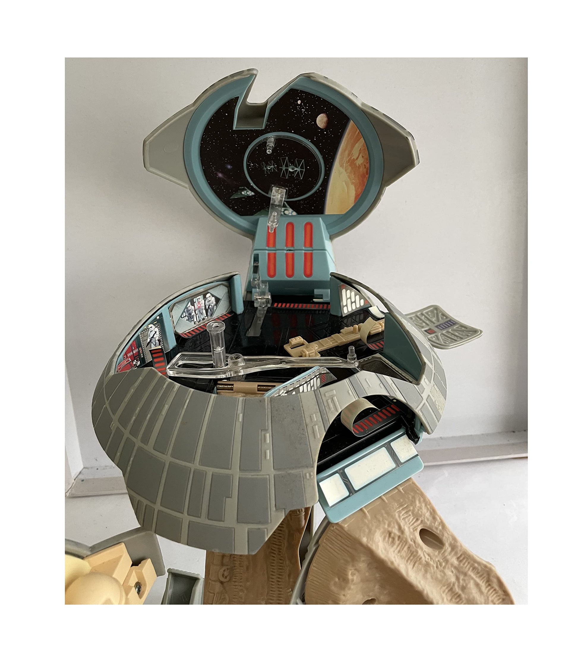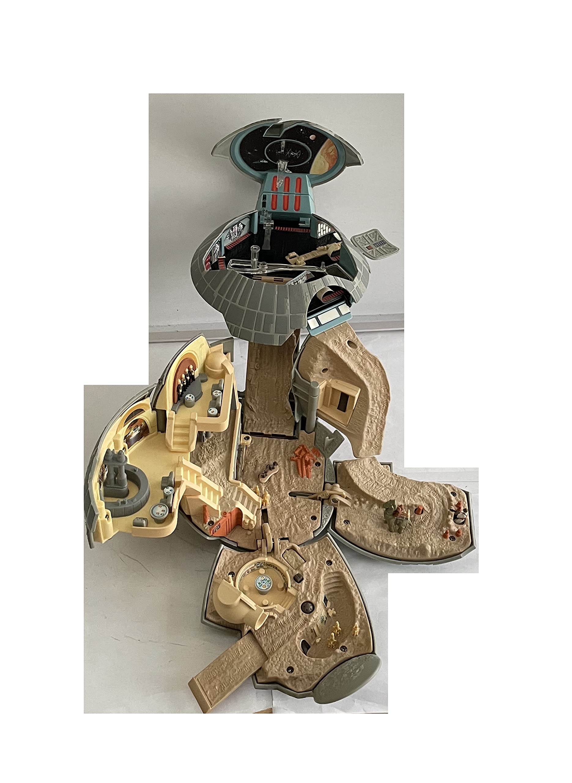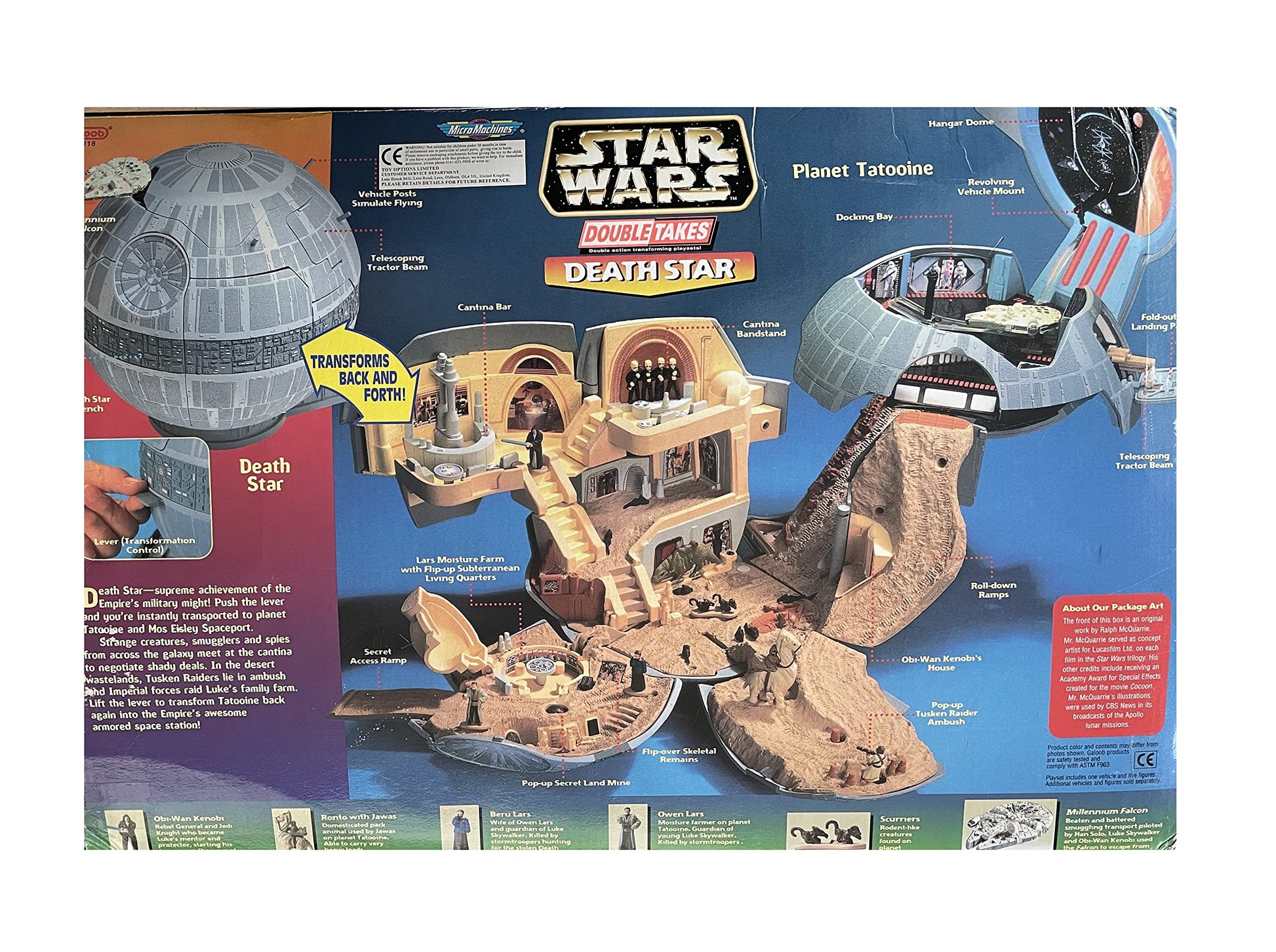 Vintage 1993 Star Wars A New Hope Micro Machines Double Takes Death Star Action Play Set Double Action Transforming Into Tatooine - In The Original Box. Released by Galoob in 1997 as part of their series of Star Wars Micro Machines Double Takes Action Play Sets. This fantastic Double Takes Death Star Double Action Transforming Play Set opens up to reveal the the planet Tatooine as seen in A New Hope and the features include - Death Star Trench, Vehicle Posts That Simulate Flying, Telescoping Tractor Beam, Hanger Dome, Revolving Vehicle Mount, Docking Bay, Fold Out Landing Pad, Roll Down Ramps, Obi-Wan Kenobi's House, Pop-up Tusken Raider Ambush, Cantina Bandstand, Cantina Bar, Lars Moisture Farm With Flip-Up Subterranean Living Quarters, Secret Access Ramp, Pop-up Secret Land Mine and Flip Over Skeletal Remains. Also includes Obi-Wan Kenobi Mini Figure, Ronto With Jawas Mini Figure and Scurrers Mini Figures. The playset is in fantastic condition, it was only ever used in a display where it spent many years before being returned to the box and stored away in a cupboard. It is in full working condition, and transforms perfectly, some of the stickers are beginning to lift due to age, but this can be easily rectified. The down side is that it is missing a few mini figures, Beru Lars and Owen Lars and also the Millennium Falcom which must have fallen out of the box at some point. Comes in the original box with the inner packing, which is in good solid condition with only some minor signs of wear on the edges. A truly amazing Star Wars playset from 25 years ago. All Orders Received Before 4.00pm Mondays to Fridays are shipped the same day