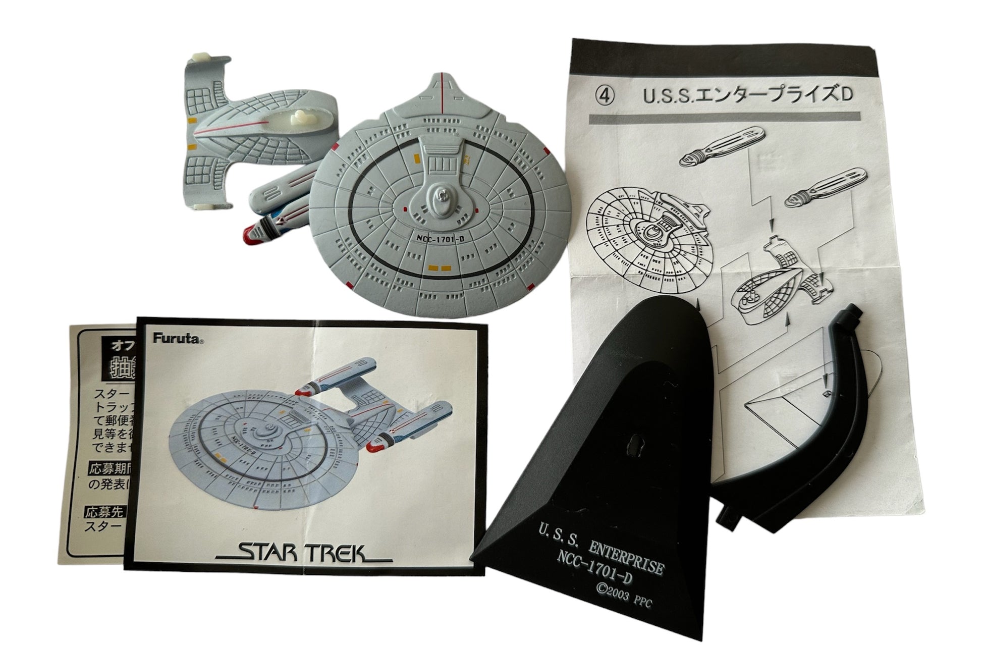 Vintage Star Trek Furuta 2005 Federation Ships And Alien Ships Collection Series 2- The USS Enterprise NCC-1701D - New In Sealed Bag. Released by Furuta in 2005 as part of their series of Trek Federation Ships And Alien Ships Collection Series 2. This fantastic Furuta Federation Ships And Alien Ships Collection Mini Snap Together Model Kit features the The USS Enterprise NCC-1701D and when assembled measures approximately 3 1/2 inches by 2 1/2 inches and is an easy assemble 4 piece snap together pre painted and decaled model, that comes complete with display stand. Former Shop Stock from a closed down toy and comic book shop. Japanese Import, no box, item sealed in original bag. All Orders Received Before 4.00pm Mondays to Fridays are shipped the same day
