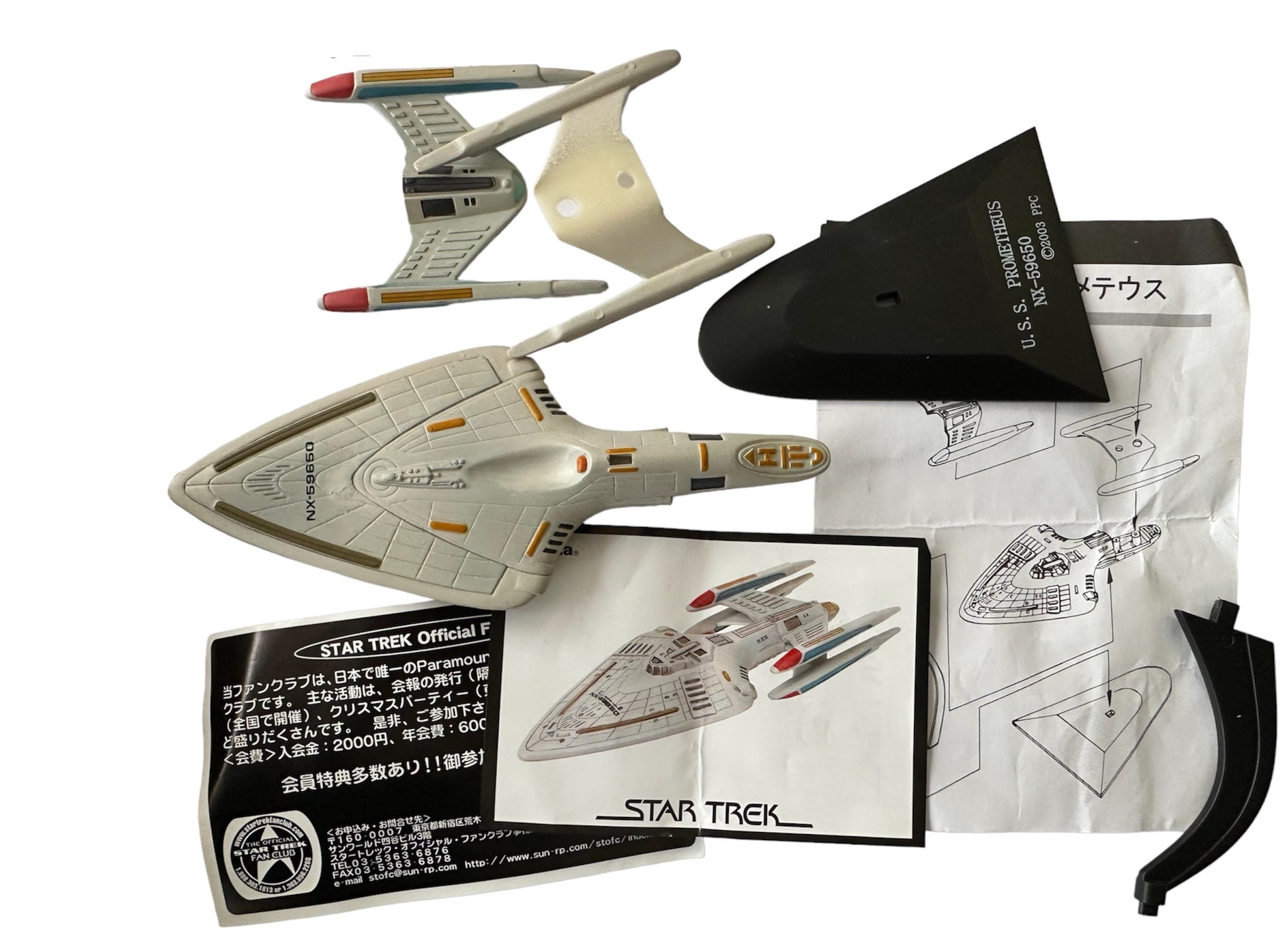 Star Trek Furuta 2005 Federation Ships And Alien Ships Collection Series 2- The USS Prometheus NX-59650 - New In Sealed Bag. Released by Furuta in 2005 as part of their series of Trek Federation Ships And Alien Ships Collection Series 2. This fantastic Furuta Federation Ships And Alien Ships Collection Mini Snap Together Model Kit features the The USS Prometheus NX-59650 and when assembled measures approximately 5 1/2 inches by inches and is an easy assemble 3 piece snap together pre painted and decaled model, that comes complete with display stand. Former Shop Stock from a closed down toy and comic book shop. Japanese Import, no box, item sealed in original bag.