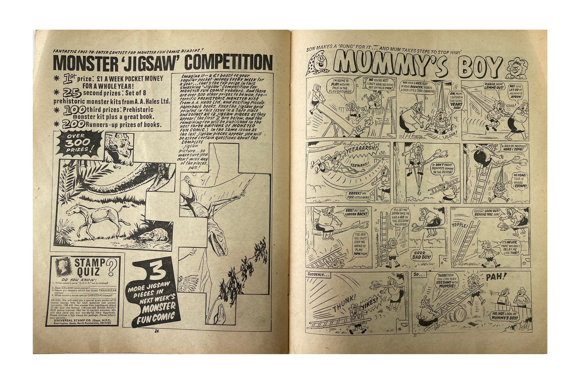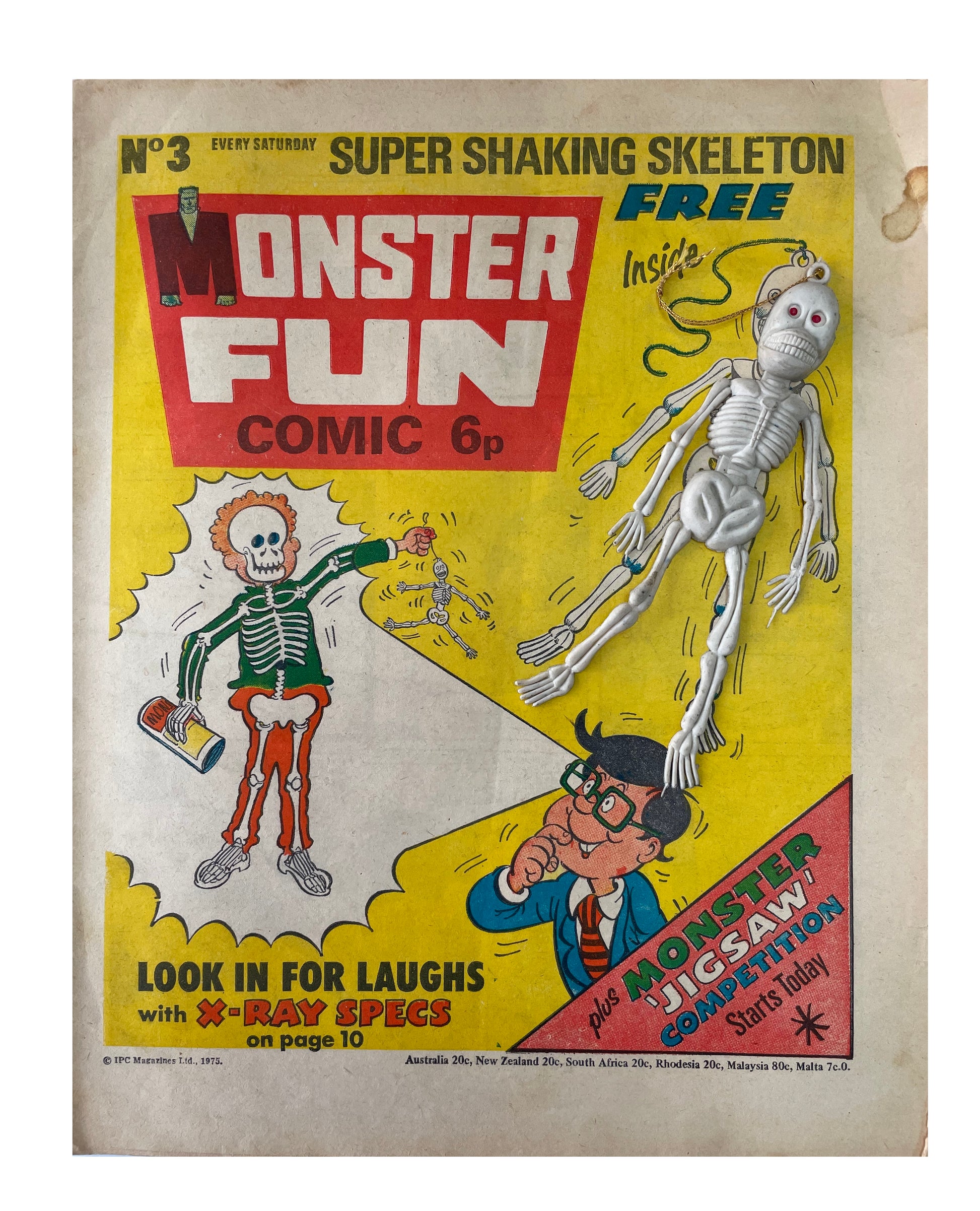 Vintage 1975 Monster Fun Comic Issue No. 3 With Super Shaking Skeleton Free Gift And Badtime Bedtime Book Pull Out - 28th June 1975 - Very Good Condition. Released by IPC Magazines Ltd on 28th June 1975 and was the third issue in the series which came with a free gift. This fantastic Monster Fun Comic Issue No. 3 features Comic Strips including - Kid Kong, Marthas Monster Make-Up, Dough Nut And Rusty, Brainy And His Monster Maker, Draculass - Daughter Of Dracula, X-Ray Specs, Grizzly Bearhug Giant, Arts Gallery, March And The Mighty Ones, Mummys Boy, Creature Teacher, Major Jump Horror Hunter, Tom Thumbscrew and The Invisible Monster, plus articles and competitions. Comes complete with the Super Shaking Skeleton and the Badtime Bedtime Book Pull Out ( has been pulled out and assembled). The comic is in very good condition over all, which is amazing when you consider it is now 47 years old. . The front and back pages are still nice and clean and bright & colourful with hardly any signs of wear, just some minor browing on the edges of the pages. Internally all 31 pages are present and attached, they are clean and bright without any damage or markings on any page, other than some very minor browning at the bottom page edges on a very small tear on the bottom of the back page, but otherwise fantastic. The Super Shaking Skeleton is also in fantastic condition as is the Badtime Bedtime Book. A truly wonderful example of a very very rare vintage Monster Fun Comic with its free gifts from 1975. All orders received before 4.00pm Mondays to Fridays are dispatched the same day