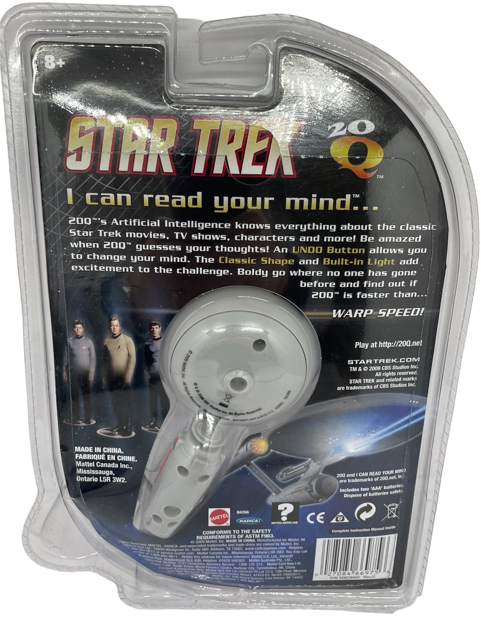 Star Trek Radica 2009 20Q I Can Read Your Mind - USS Enterprise NCC-1701 Star Ship Model Computer - Brand New Factory Sealed Shop Stock Room Find. Released by Radica in 2009 as part of their Star Trek series of 20Q ship computers. This fantastic Star Trek Enterprise Computer contains content from classic Star Trek movies, television shows, characters and more; Test your Star Trek knowledge and be amazed when 20Q guesses what you're thinking!; Classic shape and built in light; includes undo button allow you to change your mind, adding to the excitement and challenge; It's up to you to find out if 20 questions are faster than wrap speed. Brand New And Factory Sealed Shop Stock Room Find. Discovered in the store room of a closing down shop with a whole host of other die-casts from a similar era. Mint Condition & Factory Sealed. All Orders Received Before 4.00pm Mondays to Fridays are shipped the same day