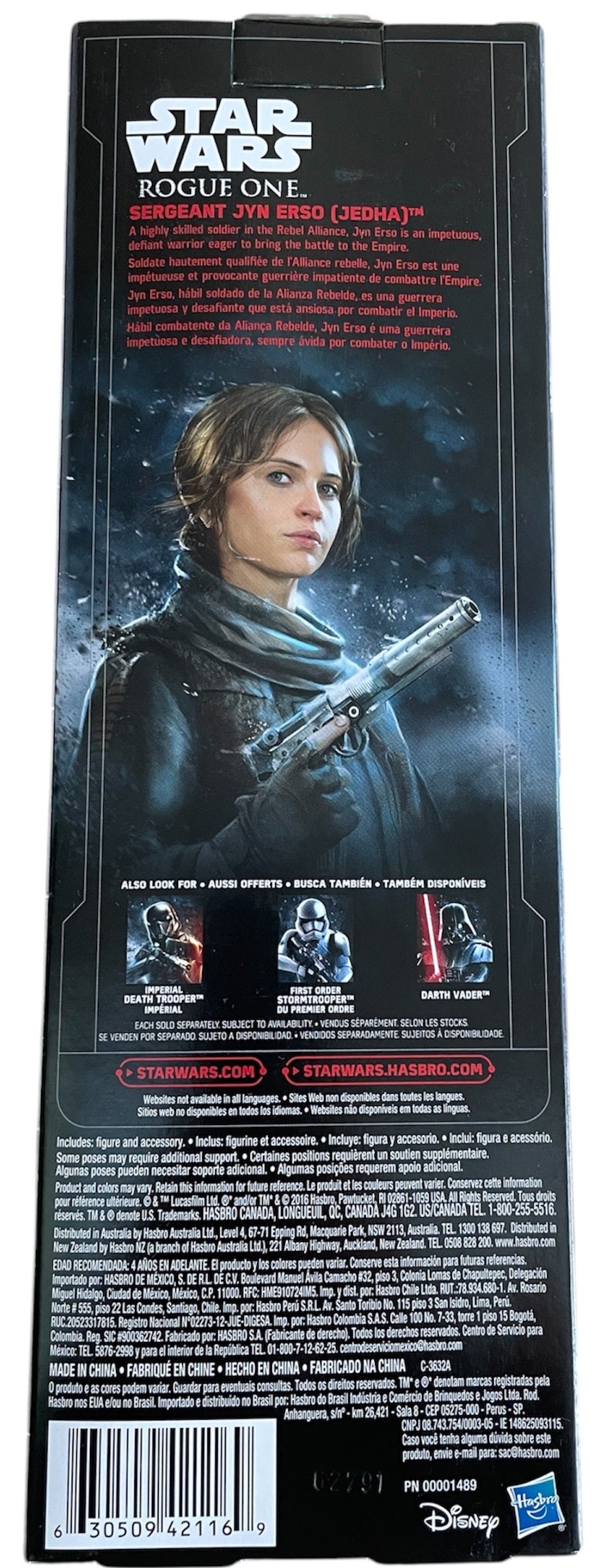 Star Wars Rogue One Sergeant Jyn Erso (Jedha) 12 Inch Action Figure. Sergeant Jyn Erso is a highly skilled soldier in the Rebel Alliance, she is an impetuous, defiant warrior eager to bring the battle to the empire. Get set for big adventure with the Star Wars Rogue One Hero Series 12-Inch Action Figures Wave 1. Each huge 12-inch scale action figure is ready to take on the entire galaxy. Ages 4 and up. Brand New Factory Sealed Action Figure. All orders received before 4.00pm Monday to Fridays are shipped the same day.