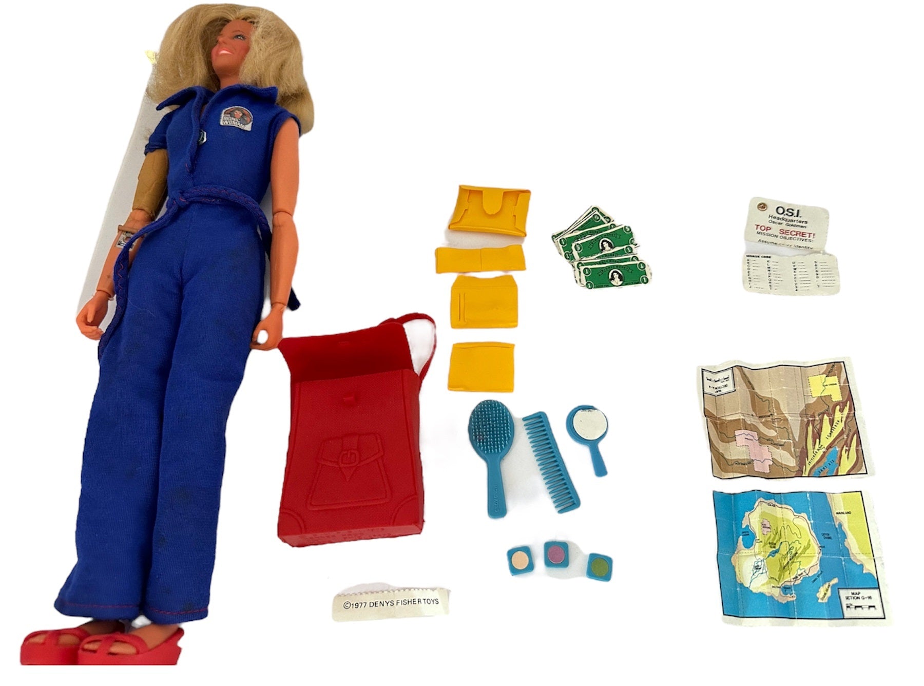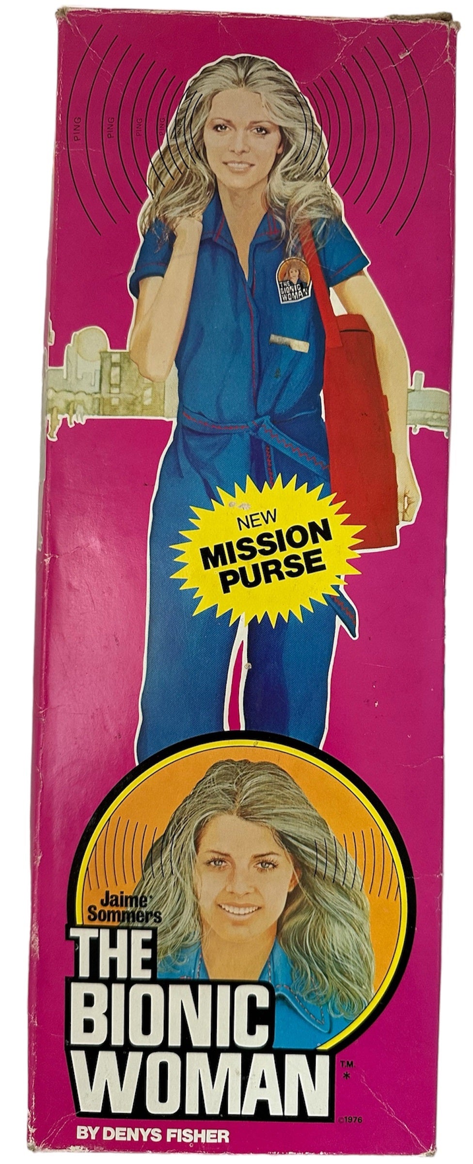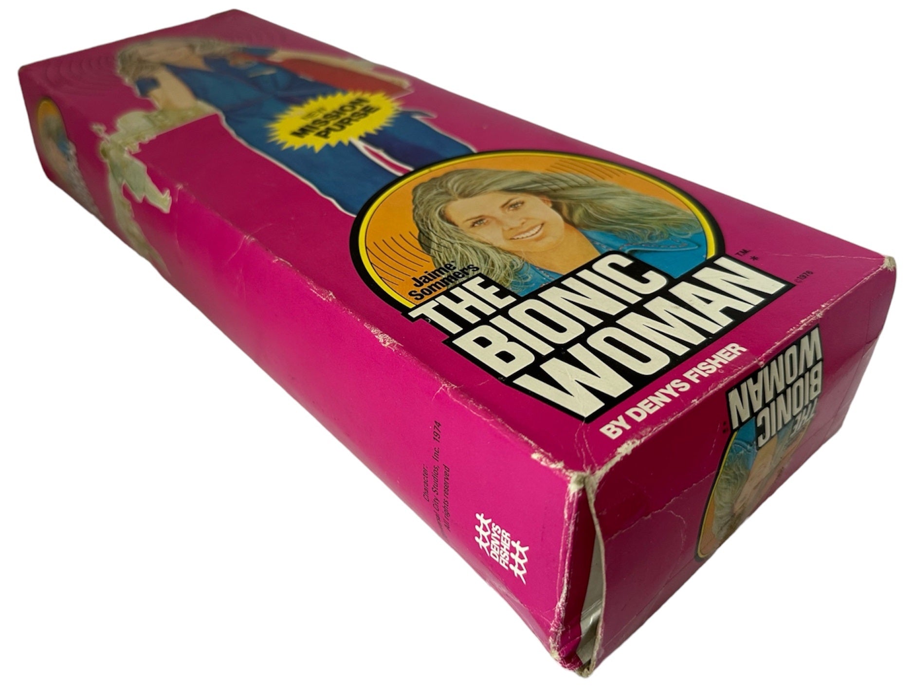 Vintage The Bionic Woman Jamie Sommers Action Figure Doll - Produced By Kenner in 1976 and distributed in the UK by Denys Fisher - In The Original Box. Beautiful, fully articulated figure modeled after Lindsay Wagner, the star of The Bionic Woman TV show. Bionic Modules in right arm and both legs. Turn her head from side to side and actually hear a Bionic pinging noise when Jaime Sommers uses her Bionic ear. Dressed in her stylish blue jumpsuit with Bionic Woman symbol on chest. Platform shoes match her Mission Purse, - literally loaded with adventures! A map case holds two maps; Top Secret mission assignment from Oscar Goldman; code-case with decoder sheet; wallet with ID card, and "money". To keep Jaime Sommers Beautiful, there's a brush and a cosmetic case complete with mirror. Jamie is in very good condition over all, which is amazing considering she is now over 48 years old, however the rubber skin on her bionic arm has partly perished with age. The mission purse is also in very good condition, and is almost complete with the exception of her I.D, but does include - Maps and Map Case, Wallet and Cash, Make Up Case With Make Up, Mirror, brush and Comb, Decoder Case and Decoder Sheet, and also includes the original instruction sheet and the Kenner catalogue. The box is also in very good condition, it is still solid and sturdy and colourful, with only minor signs of shelf wear on the edges. Does not include the inner sleeve. A truly fantastic vintage original Bionic Women from 1976. All orders received before 4.00pm Monday to Fridays are shipped the same day.