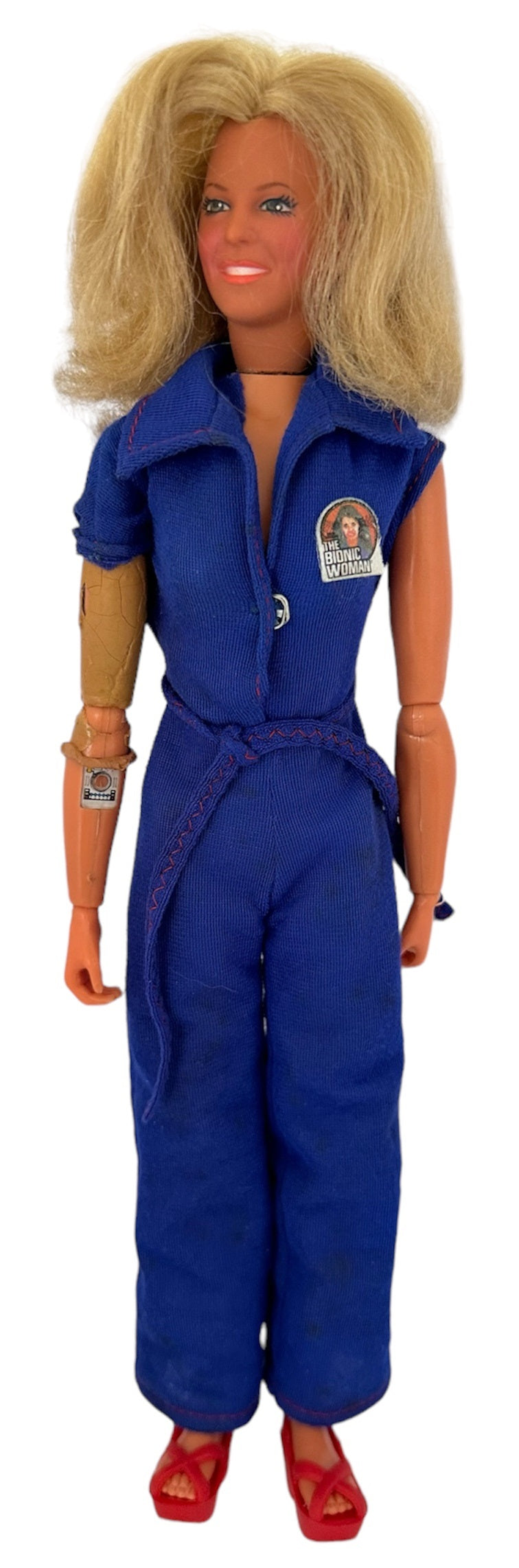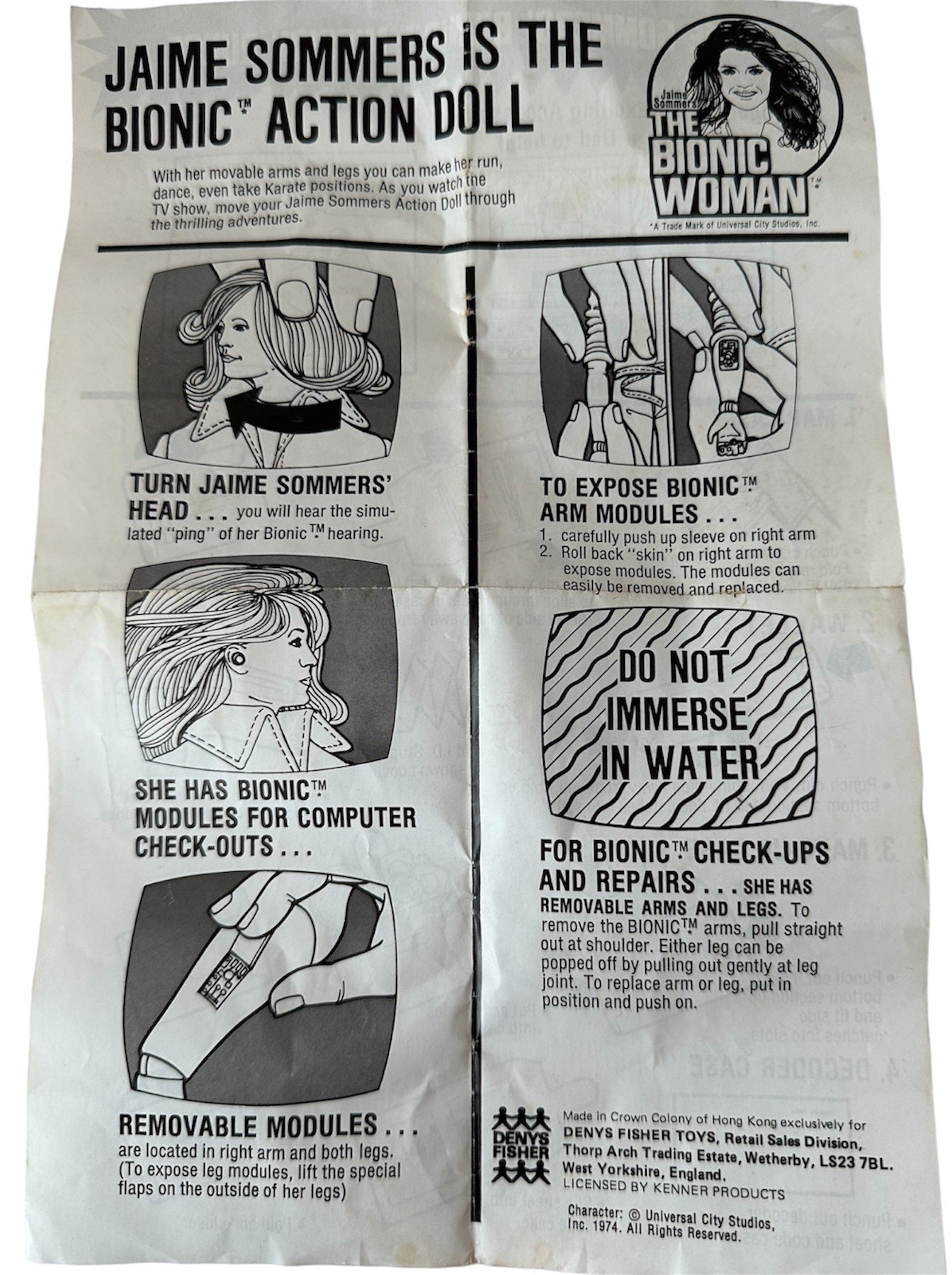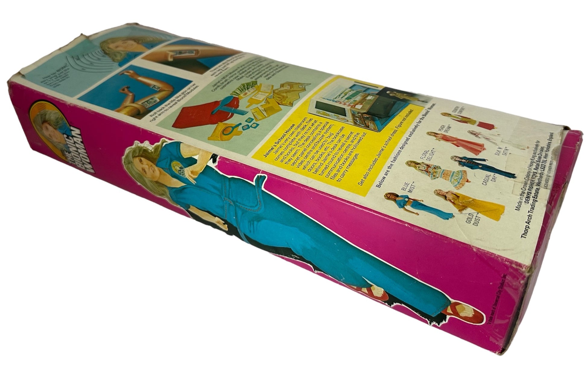 Vintage The Bionic Woman Jamie Sommers Action Figure Doll - Produced By Kenner in 1976 and distributed in the UK by Denys Fisher - In The Original Box. Beautiful, fully articulated figure modeled after Lindsay Wagner, the star of The Bionic Woman TV show. Bionic Modules in right arm and both legs. Turn her head from side to side and actually hear a Bionic pinging noise when Jaime Sommers uses her Bionic ear. Dressed in her stylish blue jumpsuit with Bionic Woman symbol on chest. Platform shoes match her Mission Purse, - literally loaded with adventures! A map case holds two maps; Top Secret mission assignment from Oscar Goldman; code-case with decoder sheet; wallet with ID card, and "money". To keep Jaime Sommers Beautiful, there's a brush and a cosmetic case complete with mirror. Jamie is in very good condition over all, which is amazing considering she is now over 48 years old, however the rubber skin on her bionic arm has partly perished with age. The mission purse is also in very good condition, and is almost complete with the exception of her I.D, but does include - Maps and Map Case, Wallet and Cash, Make Up Case With Make Up, Mirror, brush and Comb, Decoder Case and Decoder Sheet, and also includes the original instruction sheet and the Kenner catalogue. The box is also in very good condition, it is still solid and sturdy and colourful, with only minor signs of shelf wear on the edges. Does not include the inner sleeve. A truly fantastic vintage original Bionic Women from 1976. All orders received before 4.00pm Monday to Fridays are shipped the same day.