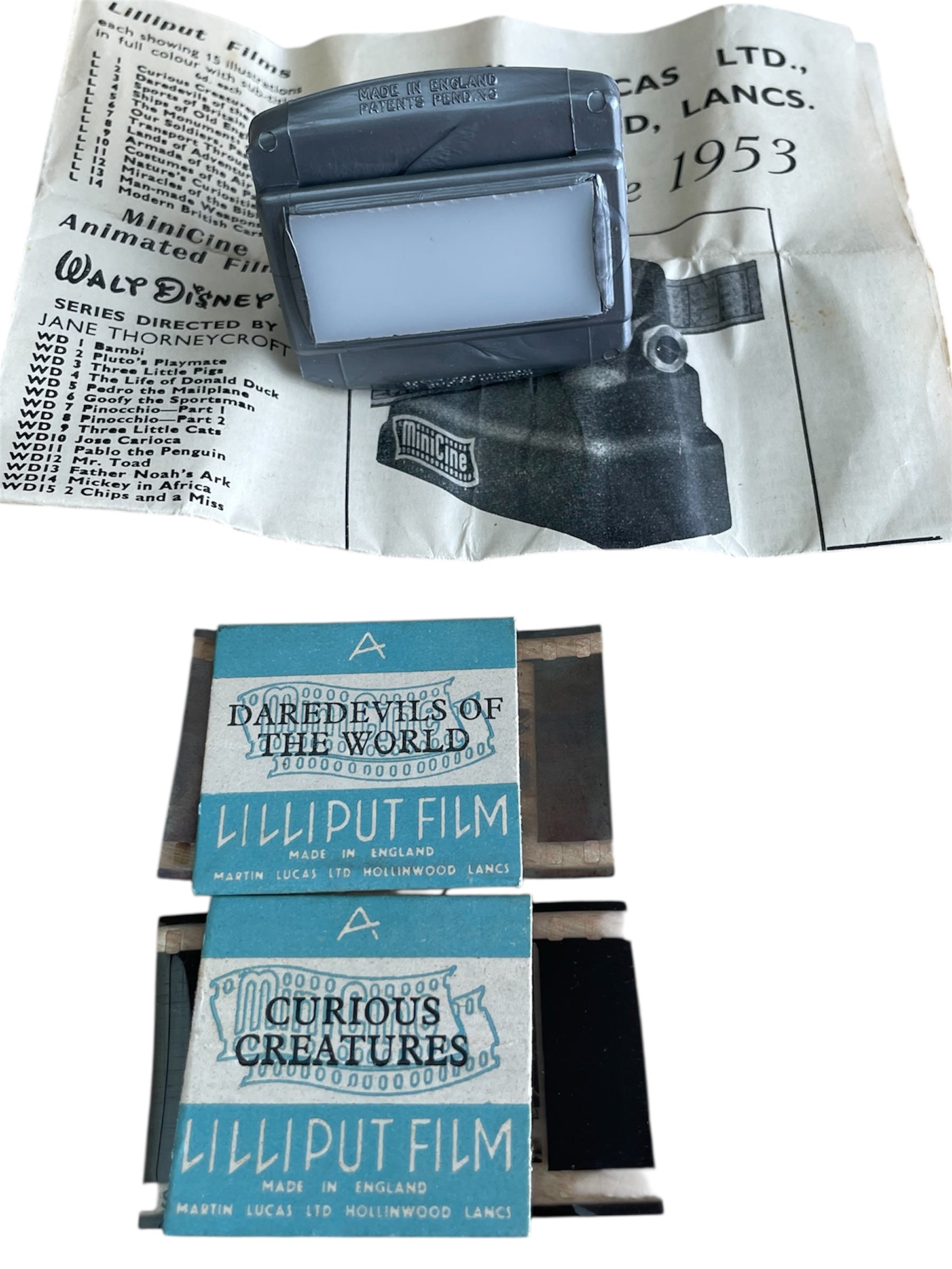 Vintage 1950's The Eagle Comics Dan Dare - Eagle Eye View Finder - With 2x Film Strips - In The Original Box. Released by Martin Lucas in the 1950's as part of their series of Dan Dare toys, and was originally given away in the Eagle Comic. This fantastic Eagle Comics Dan Dare Eagle Eye View Finder Film Viewer is finished in grey plastic and measures 5cms wide by 4 1/2cms tall by 4cms deep. The viewer features an adjustable viewing eye, that slides up and down to view multiple rows of strips. Simply insert the film strip into the viewer, hold the eye piece as close to your eye as possible, and pull the strip through to view all the images, then slide down the eyepiece to view the next row. Comes complete with 2 film strips including - Daredevils Of The World and Curious Creatures. The Eagle Eye View Finder is in very good condition over all, which is amazing, especially when you consider that it is now over 65 years old, it is in full working condition and shows very little signs of any use, if any. Comes in the original box, which is in very good condition, it is still bright and colourful with only some very very minor signs of any wear, which is mainly on the tips of the edges. A truly wonderful ultra rare vintage Dan Dare Eagle Eye View Finder from yesteryear. All Orders Received Before 4.00pm Monday To Fridays Are Shipped The same Day.