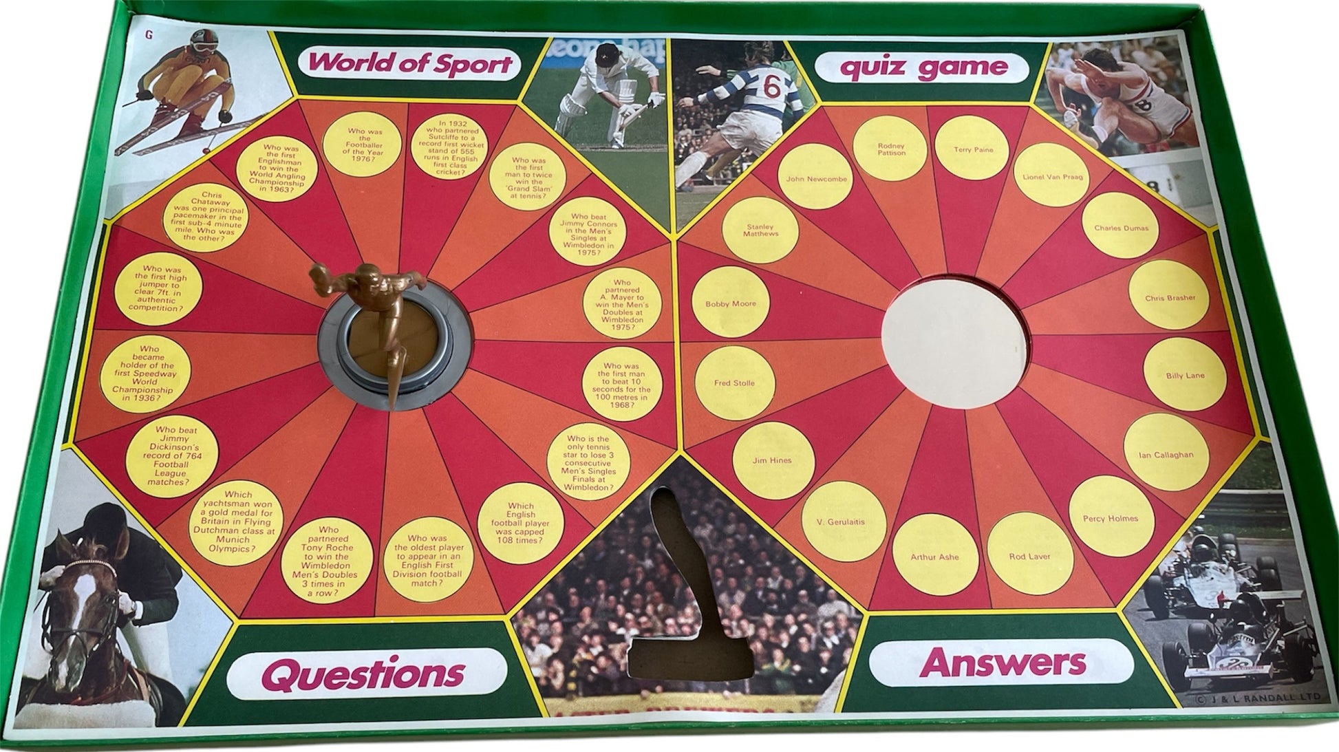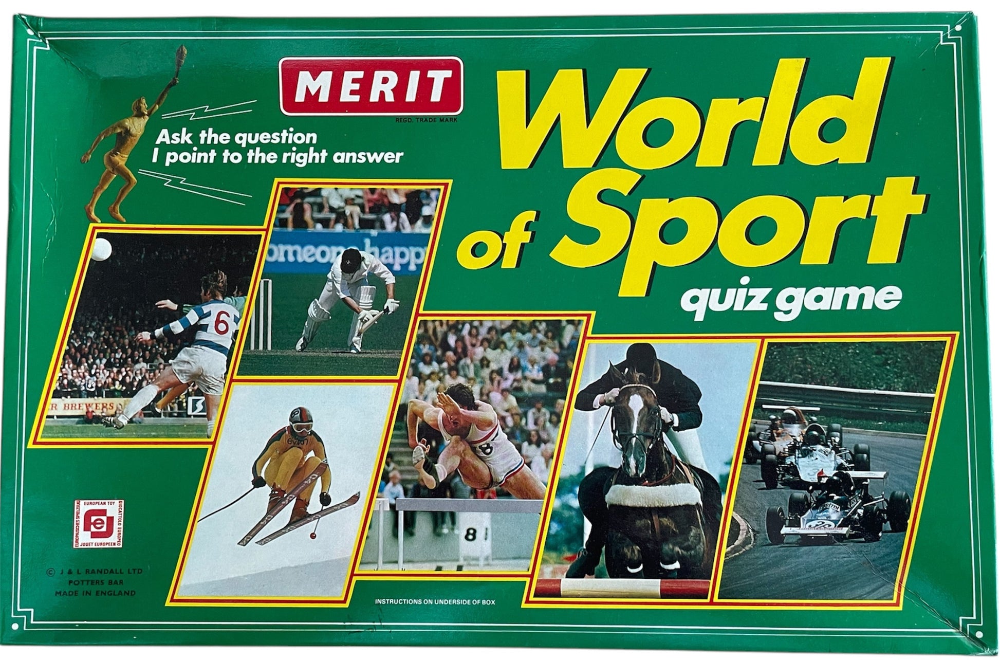 Vintage J L Randalls 1970's World Of Sport Quiz Game - A Merit Toy In The Original Box - Former Shop Counter Display Set. Released by J & L Randall Ltd in the 1970's and is very similar to The Magic Robot, but with sporting questions. This fantastic World Of Sport Quiz Game, comes with 4 double sided question and answer sheets, plus the magic Olympic Torchbearer. Point the magic Torchbearer to the centre of a question, then pick him up and put him on the answer section to find out the answer. The Torchbearer is never wrong!!! Amazing Vintage sporting Game. Former Shop Counter Display Game. Spent several months in a shop counter display before being retired to the stock room for about 50 years. The game is in mint condition and was never sold or used. Some very minor signs of shelf wear on the corner edges of the box, but otherwise perfect. A truly amazing find of a vintage quiz game from half a century ago. All orders received before 4.00pm Monday to Fridays are shipped the same day.