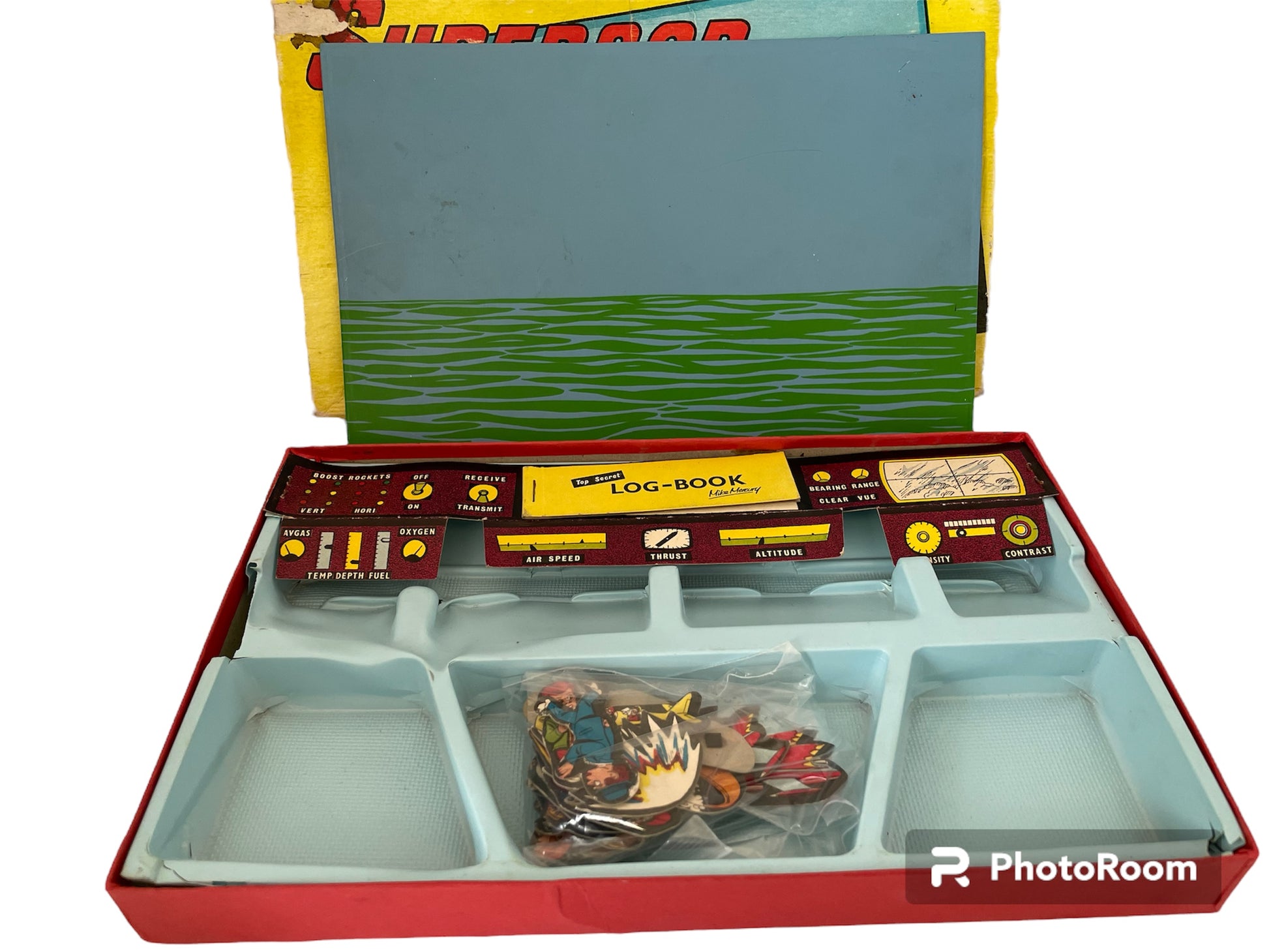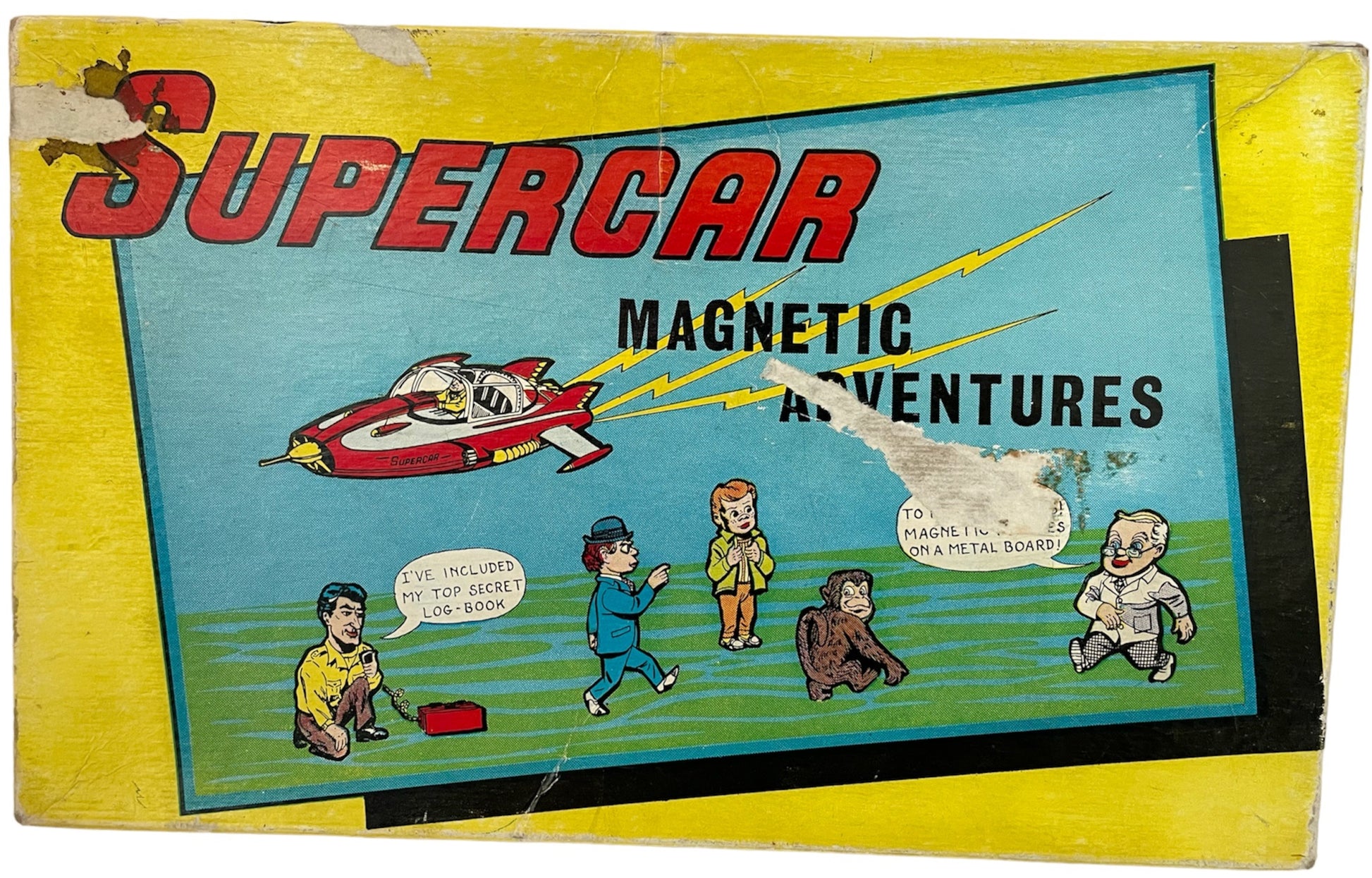 Vintage 1962 Gerry Andersons Supercar The Magnetic Adventures With Mike Mercury - Very Good Condition In The Original Box. Released by Allen Industries in 1962 when Supercar was at the height of its popularity during its first run on television. This fantastic Supercar The Magnetic Adventures With Mike Mercury is a make your own adventure game with all the main characters from the TV series plus the Supercar and many others, 19 in total. Each cardboard image has magnets attached to the back of the card which when placed on the board holds the image in place. You can make up your own adventures with the Supercar crew, or use Mike Mercury's Top Secret log Book which is attached to The Supercar dashboard, and contains the log of adventures past, which can all be recreated with the images included. The Supercar Magnetic Adventures game in very good condition over all, which is amazing considering its age, all the pieces are still nice and firm, and attach to the board very well. The dashboard is also in very good condition with only minor signs of wear and the log book is also in fantastic condition and is still attached to the dashboard. Comes in the original box which is also in very good condition for its age but does have some minor wear along the edges, and a few minor scuffs, and includes the plastic inner tray. A truly amazing vintage Supercar item from 1962. All orders received before 4.00pm Monday to Fridays are shipped the same day.