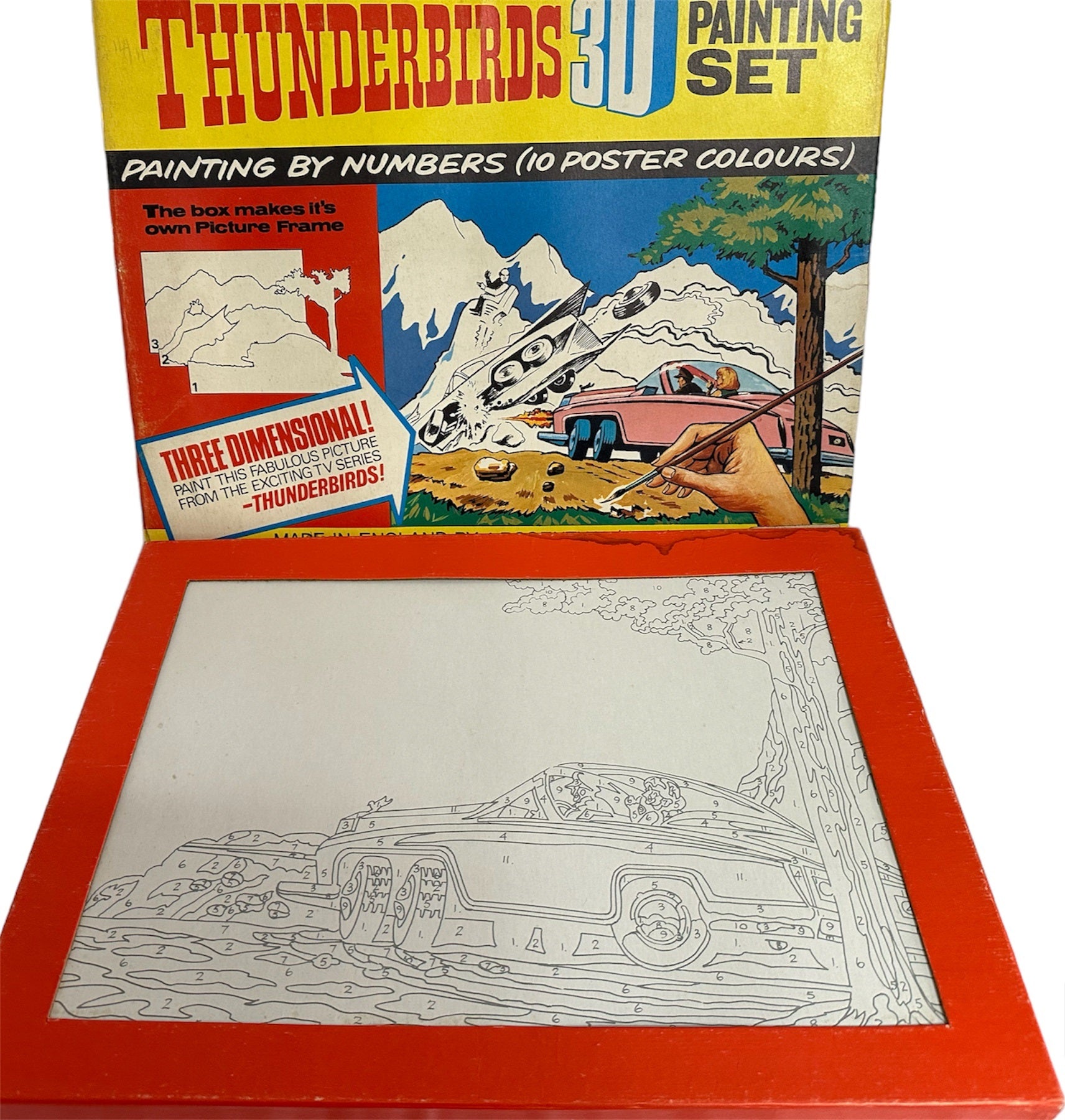 Vintage 1964 Gerry Andersons Thunderbirds JR21 3D Painting Set Number 1 - Lady Penelope Scores A Hit By J Rosenthal Toys Ltd - Unused In The Original Box. Released by J Rosenthal Toys Ltd in 1964 during Thunderbirds original television run. This fantastic Thunderbirds 3D Painting Set is number 1, Lady Penelope Scores A Hit. This is a painting by numbers picture which you paint, and them separate to form the 3D picture, and the box becomes the picture frame. Includes the pictures to paint, poster colour paint set, paint brush and box frame. This item is in unused condition, but the box does have some shelf wear which is mainly along the edges. A truly fantastic example of a very very rare vintage Thunderbirds item from 1964. All Orders Received Before 4.00pm Mondays to Fridays are shipped the same day.