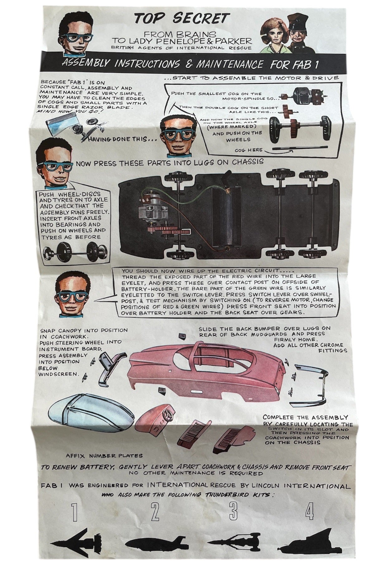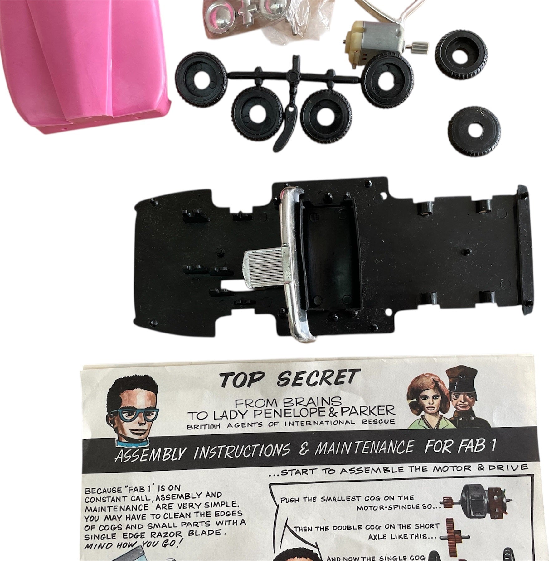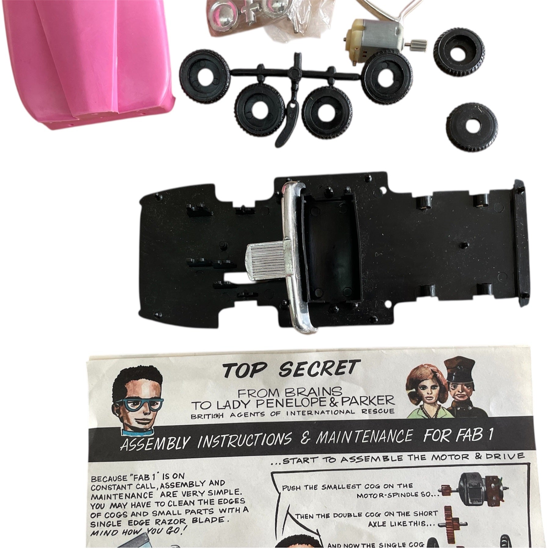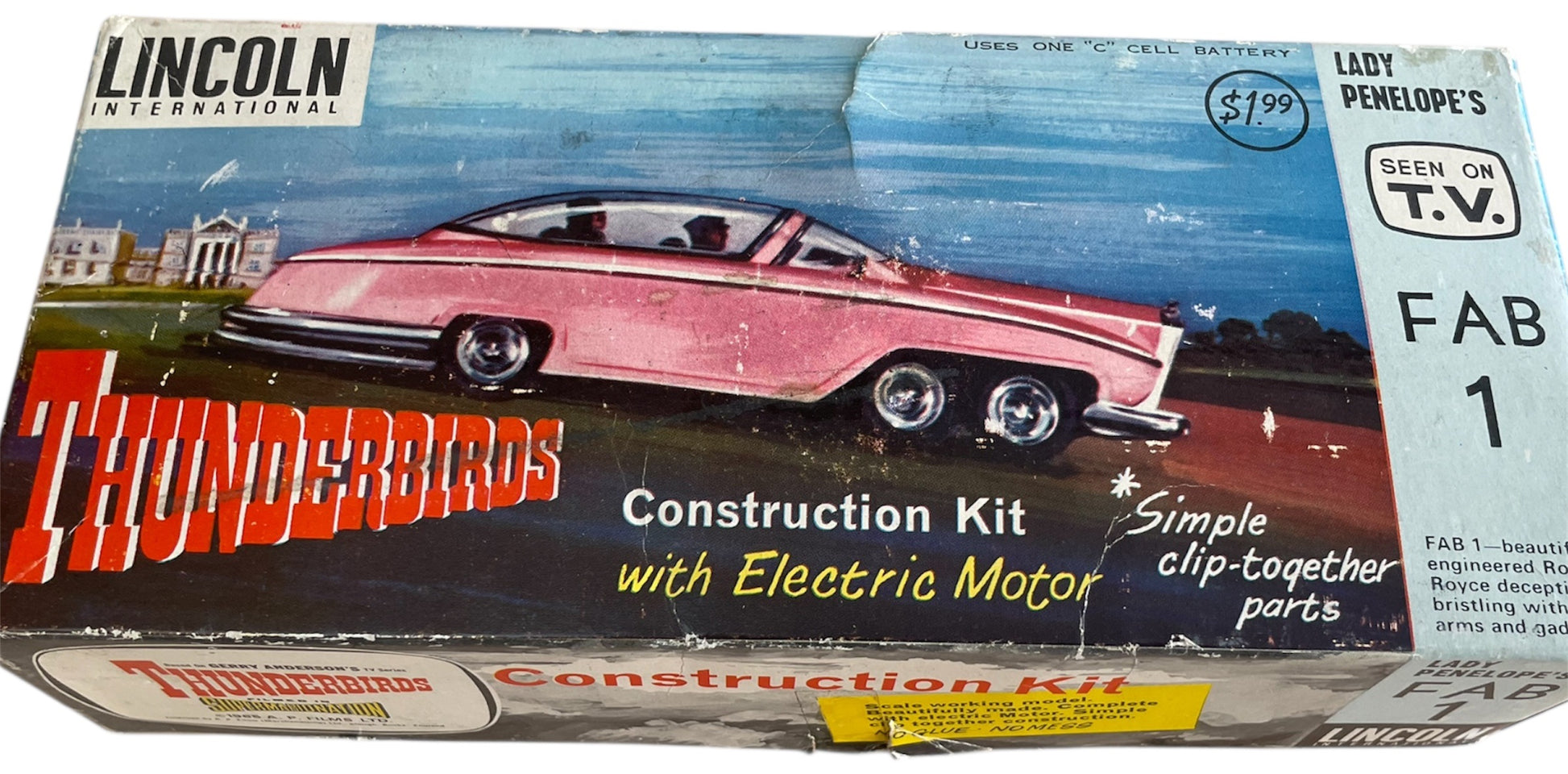 Vintage 1965 Lincoln International - Gerry Andersons Thunderbirds FAB 1 Snap Together Construction Kit With Electric Motor - Unsold Shop Stock - Mint Condition In The Box. Released by Lincoln International in 1965 as part of their series of Thunderbirds Snap Together Construction Kits With Electric Motors. This Fantastic Thunderbirds FAB 1 construction kit is a scale model of Lady Penelope's Pink Rolls Royce as seen in the original 1960's television series, it is beautifully made and highly detailed clip together construction complete with electric motor. The model measures over 8 inches long when fully assembled, and does not require any glue, so no mess. Former Unsold Shop Stock From A closed Down Toy And Comic Book Shop. The set is fully complete and in mint condition, including the instruction sheet and comes in the original box, which is also in fantastic condition, but does have some minor signs of shelf wear, but is still clean, colourful and displays fabulously. A truly fantastic find and ideal for the true Thunderbirds collector. All orders received before 4.00pm Monday to Fridays are shipped the same day.