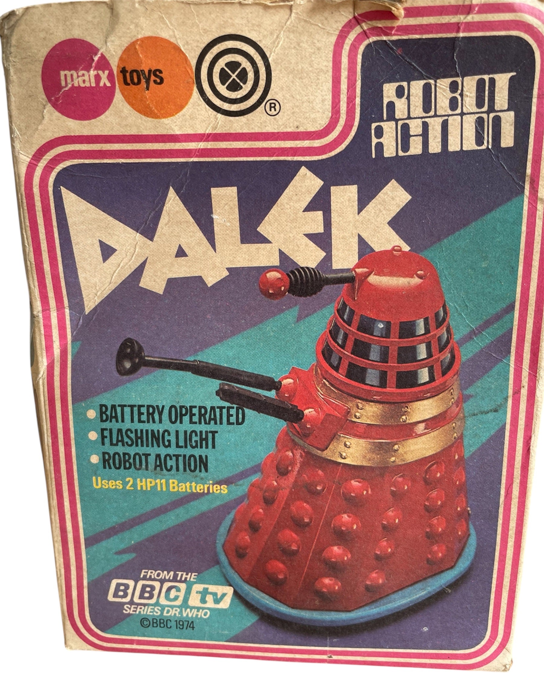 Vintage Louis Marx 1974 Doctor Dr Who Robot Action Battery Operated Red Dalek - Fully Working In The Original Box. Released by Louis Marx in 1974 as the reissue of their originally released battery operated Daleks from the 1960s but now in new bright colours. This fantastic Battery Operated Dalek is the brightly coloured red colour and stands 6 inches tall and comes complete with Eystalk, Plunger and gun. This reissue Dalek features include - Flashing Dome Lights, Robot Action and is Battery Operated. Fantastic condition fully working with bump and go action with flashing dome light. Comes complete in the original box which is in good condition over all, but does have some wear and tear which you would expect from an item of this age. Don't miss this fantastic opportunity to own this very very rare full working vintage Dr Who Dalek from 1974. All Orders Received Before 4.00pm Monday To Fridays Are Shipped The same Day