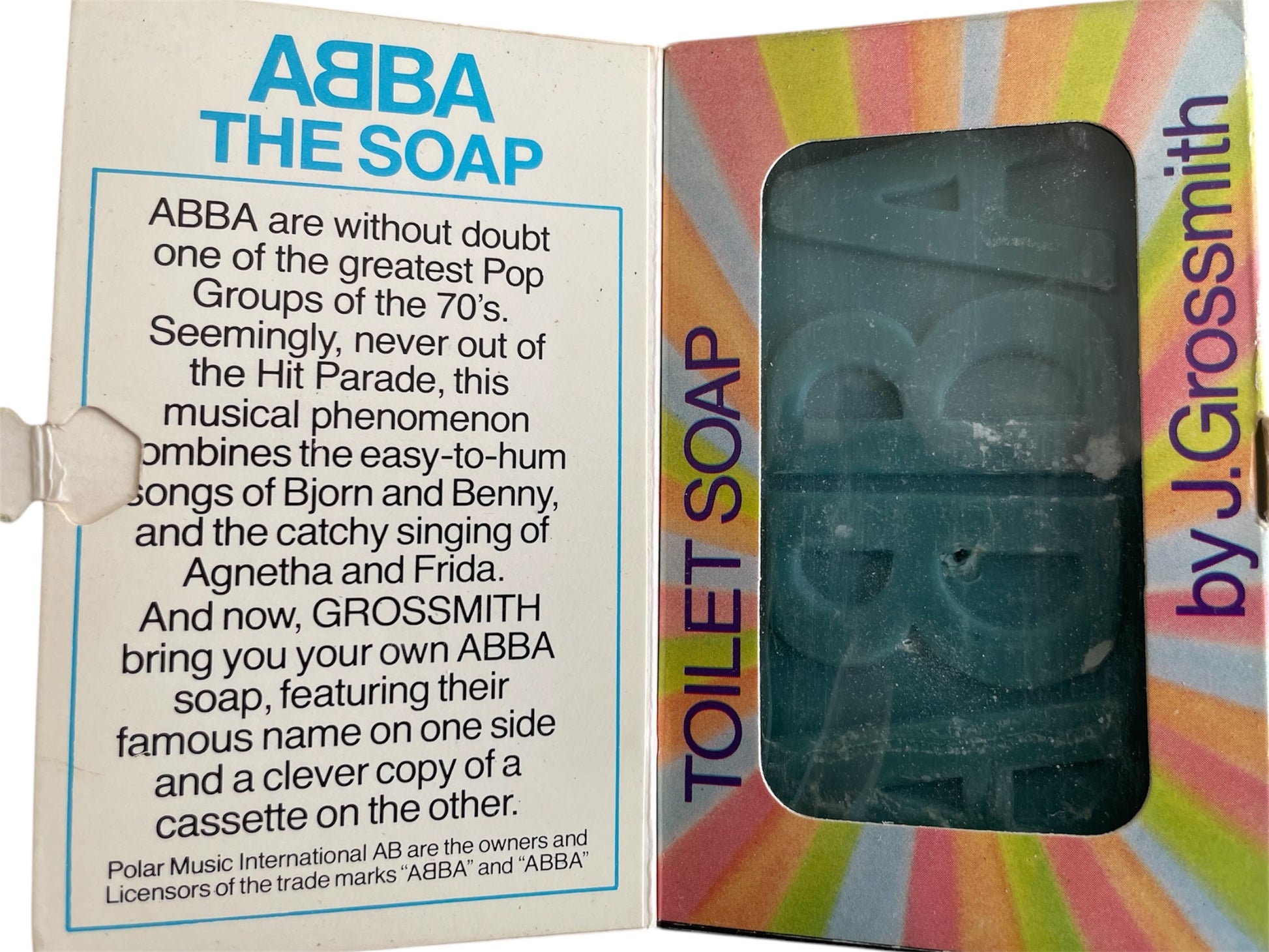 Vintage 1978 Abba The Soap Bar - Novelty Soap Bar In The Shape Of An Audio Cassette - Unused Former Shop Stock. Released in 1978 by J Grossmith as part of their series of novelty soap bars. This fantastic novelty soap bar features one of the greatest pop groups of the 1970's - ABBA. Seemingly, never out of the hit parade, this musical phenomenon combines the easy to hum songs of Bjorn and Benny, and the catchy singing of Agnetha and Frida. J Goldsmith brings you your own Abba Soap, featuring their famous name on one side and a clever copy of a cassette on the other. Former Shop Stock from a closed down novelty gift shop. The box is also in very good condition, but does have some shelf wear along the edges. All orders received before 4.00pm Monday to Fridays are shipped the same day.