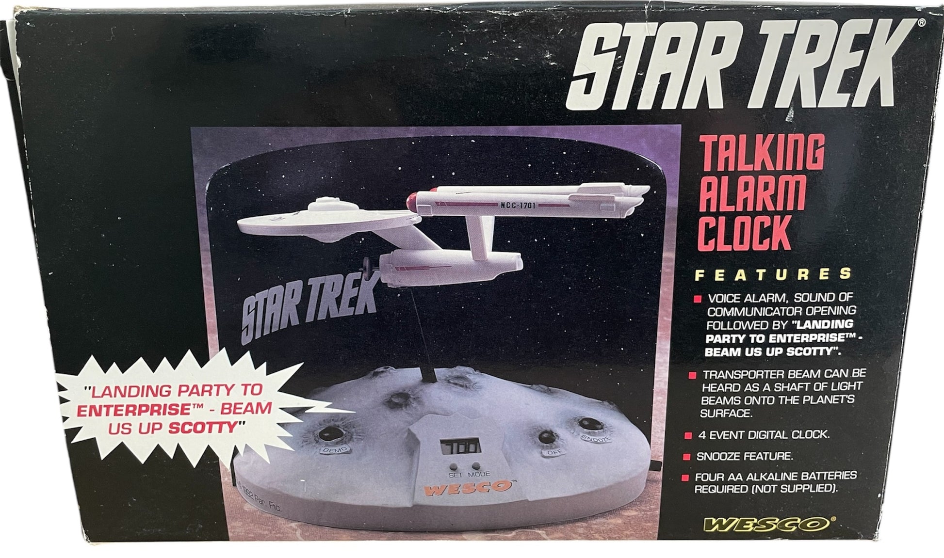 Vintage 1993 Star Trek The Original Series USS Enterprise NCC-1701 Talking Alarm Clock - Shop Stock Room Find. Released By Wesco in 1993 as part of their series of Star Trek talking alarm clocks. This fantastic USS Enterprise NCC-1701 Talking Alarm Clock is highly detailed and true to the original Starship Enterprise, with features that includes - Voice Alarm, The Sound Of A Communicator Opening Followed By "Landing Party To Enterprise - Beam Me Up Scotty", Transporter Beam Can Be Heard As A Shaft Of Light Beams Onto The Planets Surface, 4 Event Digital Clock, Snooze Feature. Requires Four AA Alkaline Batteries Which Are Not Included. Brand New Shop Stock Room Find. Discovered in the store room of a closing down shop with a whole host of other Star Trek items from a similar era. Some minor signs of shelf wear along the edges of the box, but otherwise perfect. All Orders Received Before 4.00pm Mondays to Fridays are shipped the same day