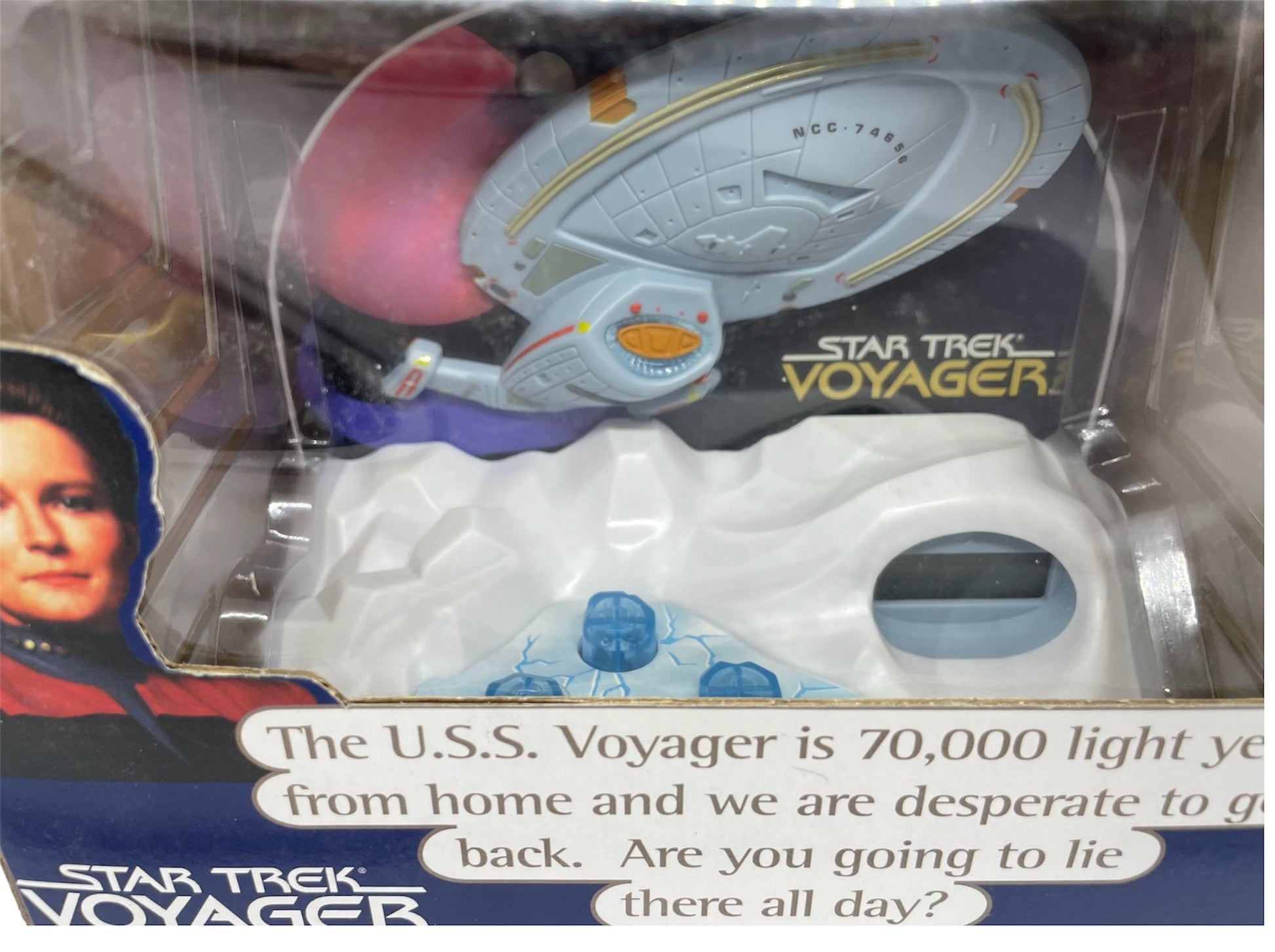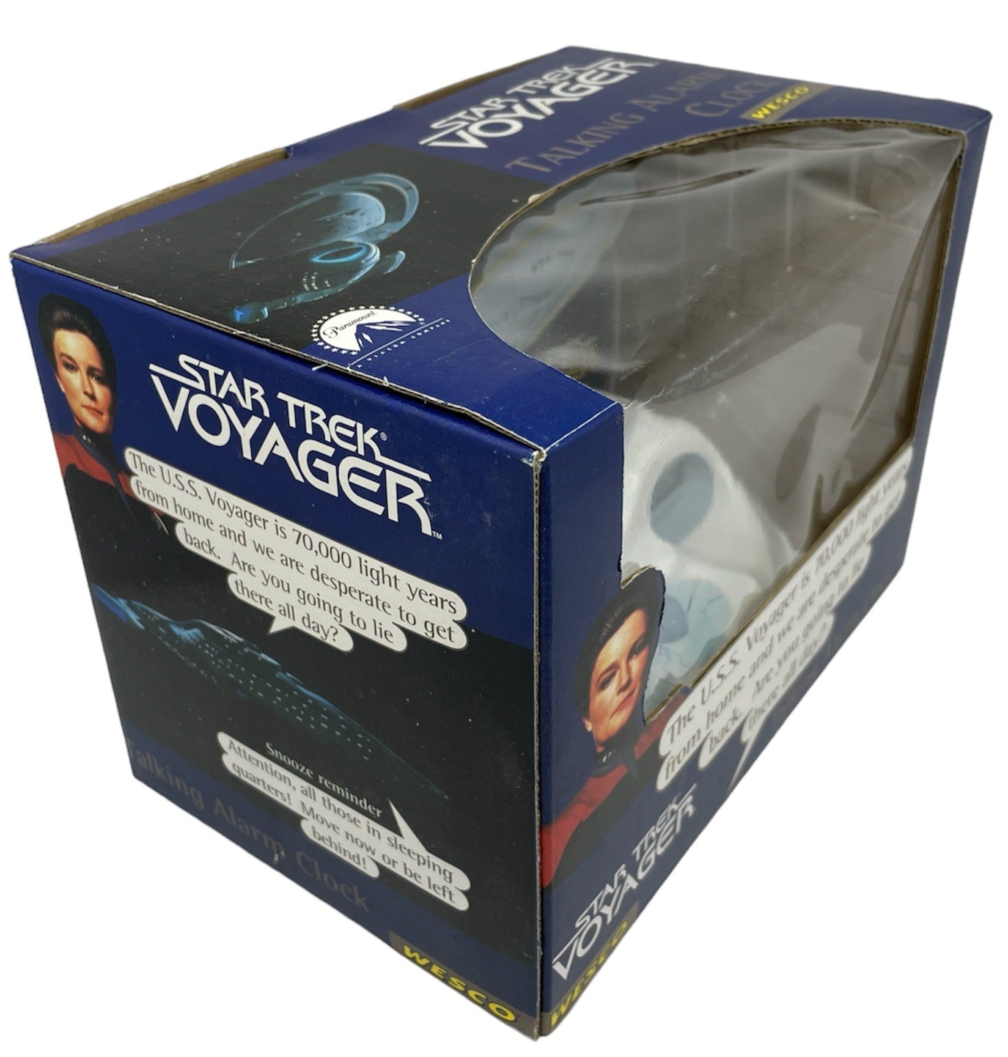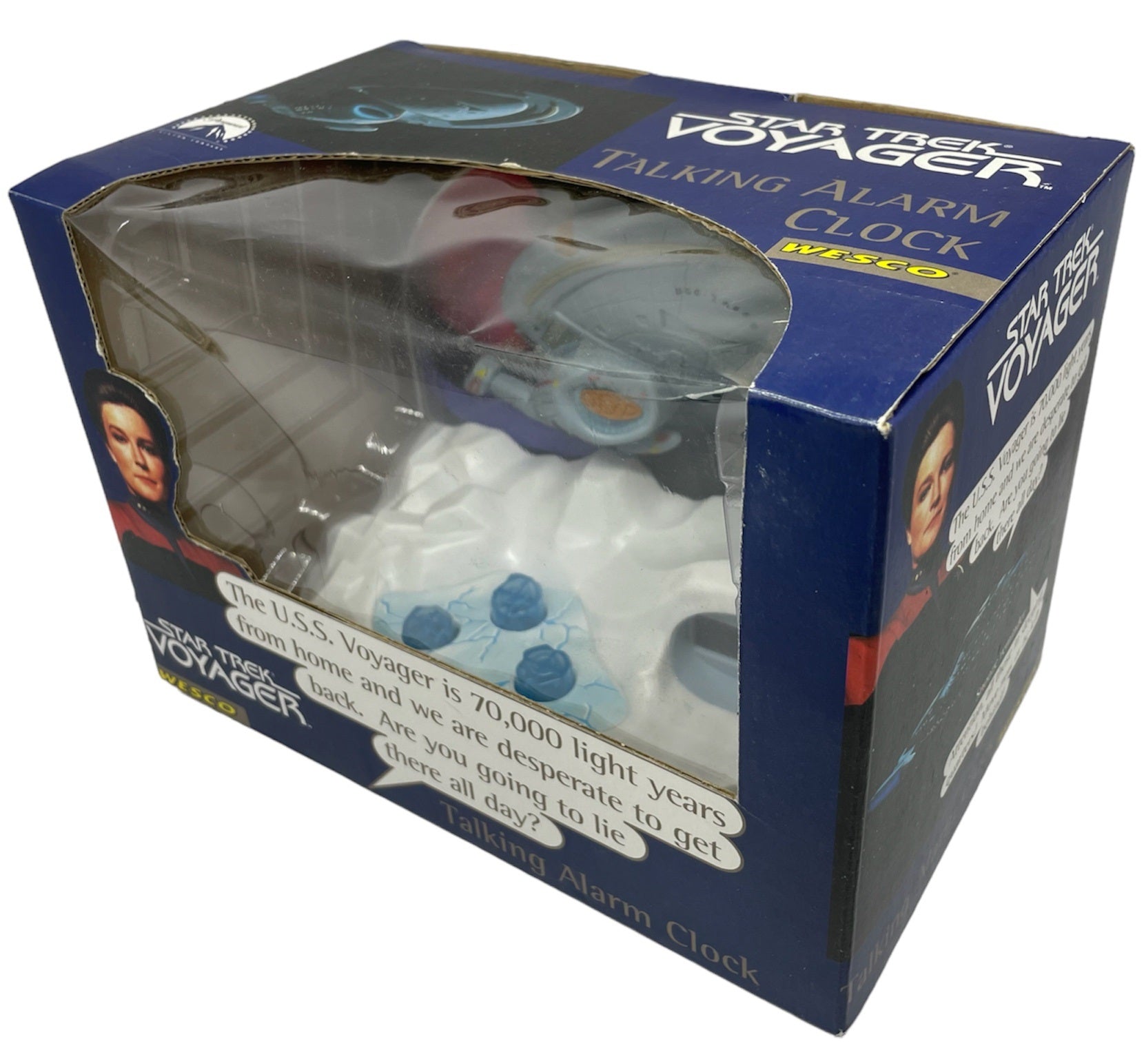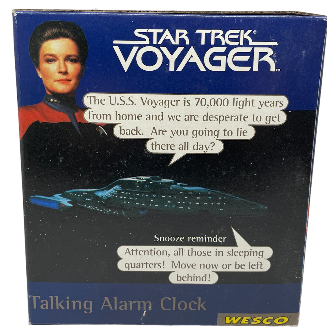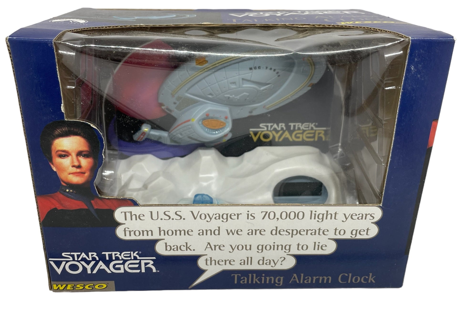 Vintage 1996 Star Trek Voyager NCC-74565 Talking Alarm Clock - Factory Sealed Shop Stock Room Find. Released By Wesco in 1996 as part of their series of Star Trek talking alarm clocks. This fantastic Voyager NCC-74565 Talking Alarm Clock wakes you up to the sound "The USS Voyager is 70,000 light years from home and we are desperate to get back. Are you going to lie there all day?". The snooze reminder says " Attention, all those in sleeping quarters! Move now or be left behind. Simple LCD display and includes a Demo button, Snooze feature, Illuminating Radar Dish and 24 hour illuminated LCD. Factory Sealed Shop Stock Room Find. Discovered in the store room of a closing down shop with a whole host of other Star Trek items from a similar era. All Orders Received Before 4.00pm Mondays to Fridays are shipped the same day