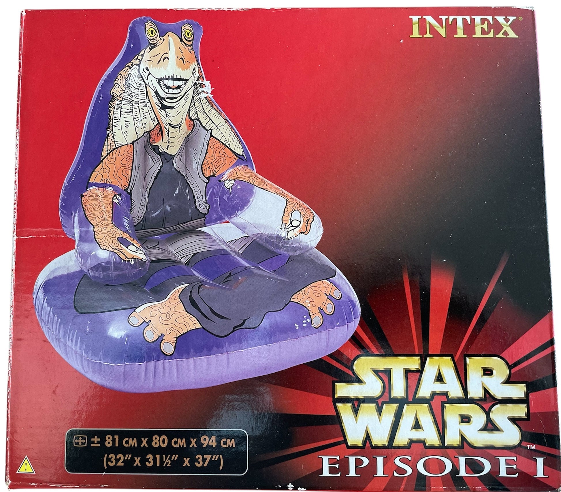 Vintage 1999 Star Wars Episode 1 The Phantom Menace Jar Jar Binks Inflatable Chair - Ex Shop Stock. Released in 1999 as part of a series of Star Wars Inflatable Chairs. This fantastic Star Wars Episode 1 The Phantom Menace Inflatable Chair features the loveable Gungan Jar Jar Binks, and is portable, durable and stable, with comfortable armrests and back rest and is made from heavy gauge vinyl and when fully inflated measures 32 inches by 32 inches by 37 inches. Former Shop Stock From A Closed Down Toy And Comic Book Shop. The Box has been opened but the contents remain unused. Some minor signs of shelf wear along the edges of the box, but otherwise perfect. All orders received before 4.00pm Monday to Fridays are shipped the same day