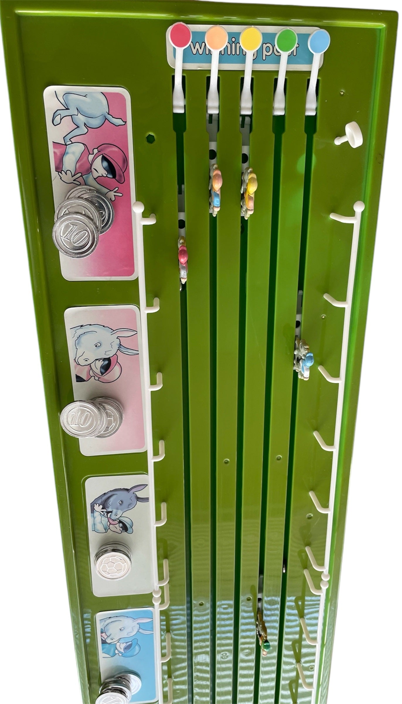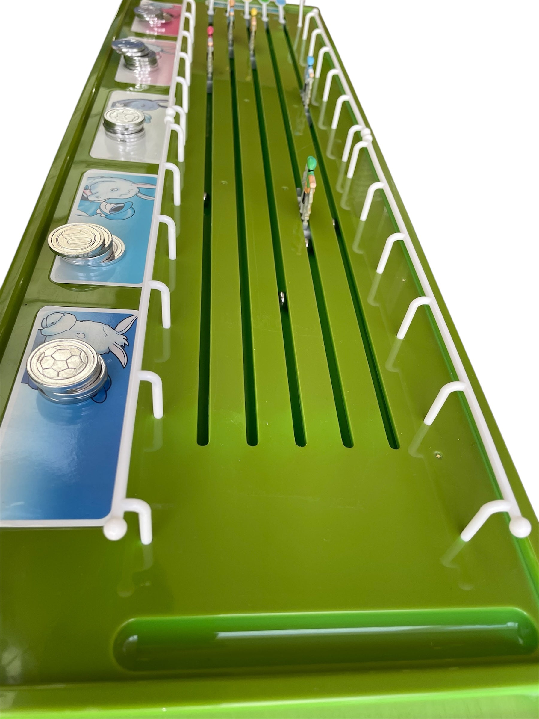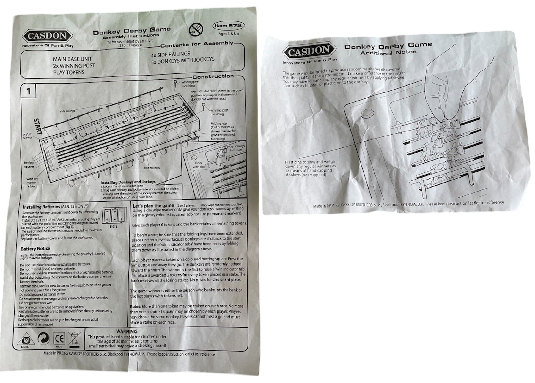 Vintage Casdon 2005 - Electronic Donkey Derby Game - Fantastic Condition - Fully Working - Complete In The Original Box. Released by Casden in 2005 as part of the series of electronic table top games. This fantastic Electronic Donkey Derby Game is a reproduction of the classic arcade game, where you bet on a horse to win the race. Each player places a token on a coloured betting square, press the on button and away they go, the donkeys are nudged randomly towards the finish line. The winner is the fist to raise the win indicator tab. The winner receives 2 tokens for every token placed as a stake, with the bank collecting all the losing stakes. The winner is the last player with tokens left, or the one who bankrupts the bank. The game is in fantastic condition over all, which is amazing for a game which is over 20 years old, it is fully working and 100% complete and does not look like its had much use, with the betting tokens still sealed in the bag. Comes in the original box which is also in very good condition for its age, but does have some minor wear along the edges. Don't miss out on your chance to own a very rare and vintage game from 2005. All orders received before 4.00pm Monday to Fridays are shipped the same day.