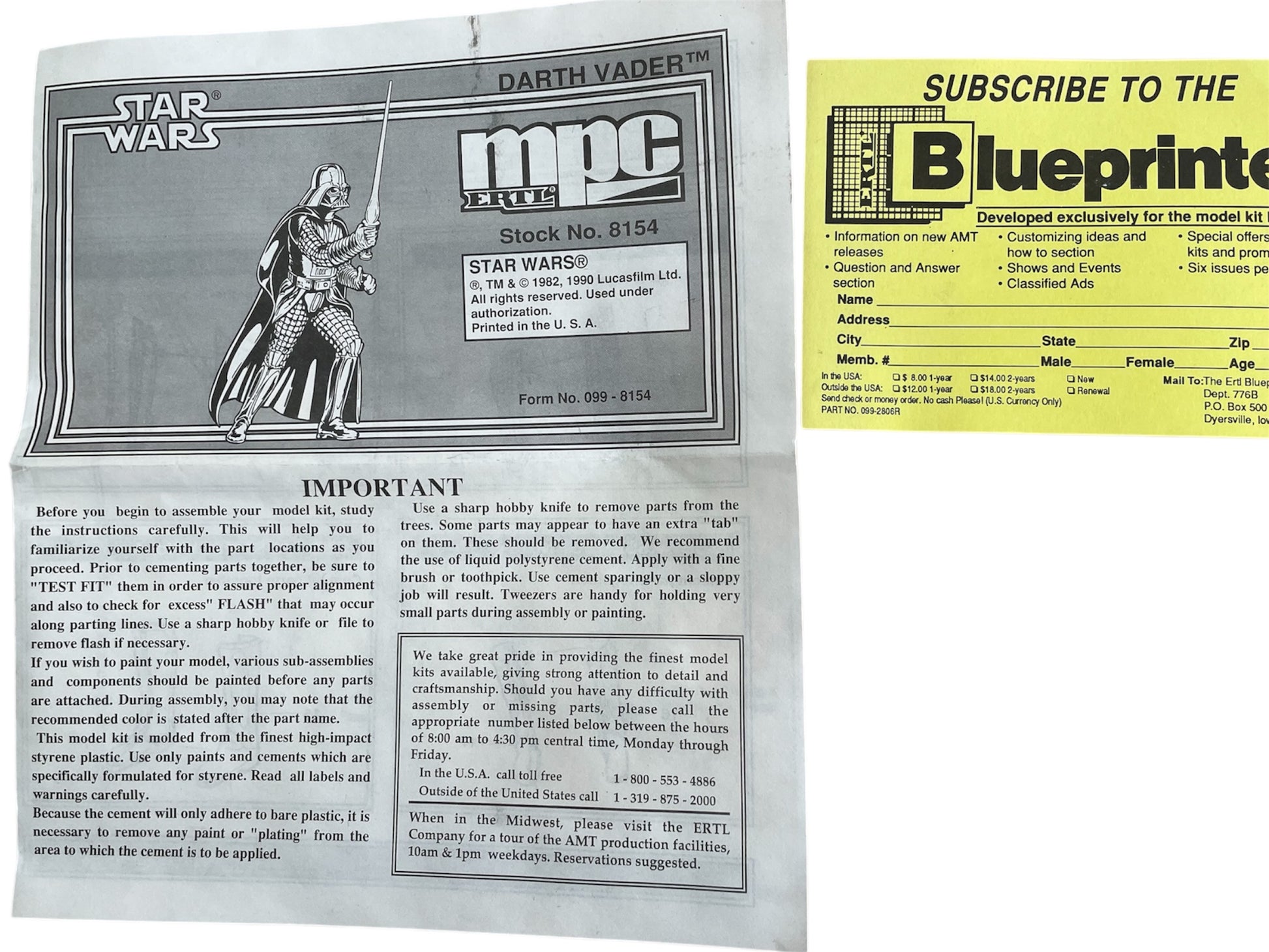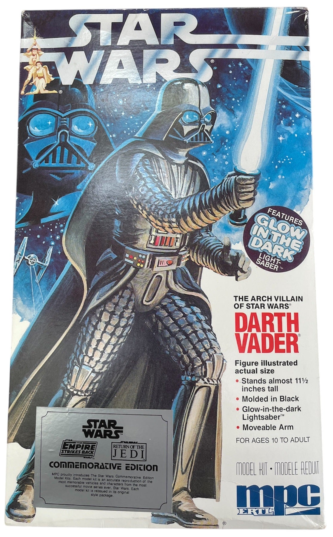 Vintage AMT/ERTL 1992 Star Wars The Original Trilogy Commemorative Edition - The Arch Villain Darth Vader Scale Model Kit - Fully Built Former Shop Display Model - With The Original Box. Released by AMT/ERTL in 1992 as part of their series of Star Wars The Original Trilogy Commemorative Edition Model Kits. This fantastic Darth Vader Model Kit measures 11 1/2 inch by 6 inch by 5 inch it is highly detailed with features that include Moulded In Black Plastic, and Glow In The Dark Lightsaber. Former Shop Counter Display Model - Built as a display piece for a shop counter display, where it spent many months before being returned to the box and retired to the stock room for over 30 years. Also had a wooden stand purpose made for it which is included with the model. The model is in very good condition over all, which is amazing considering its age, it is still strong and sturdy, but may require some paint touch up due to age and storage. Comes with the original box and instruction sheet. All Orders Received Before 4.00pm Mondays to Fridays are shipped the same day