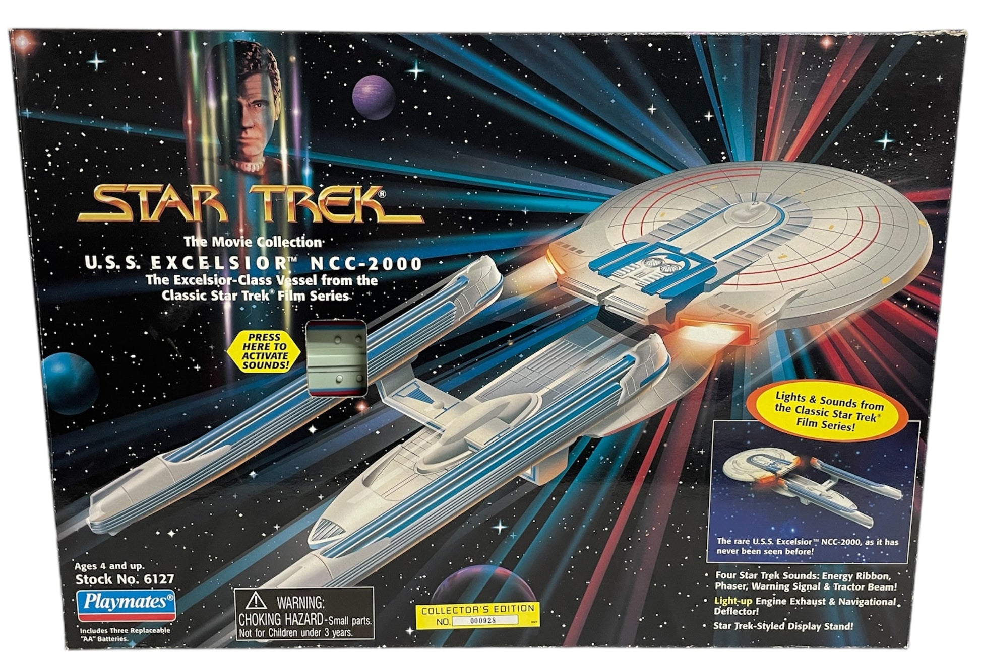 Vintage 1995 Playmates Star Trek The Movie Collection Electronic U.S.S. Excelsior NCC-2000 Replica Model Starship - Factory Sealed Shop Stock Room Find. Released by Playmates in 1995 as part of their series of Star Trek The Movie Series Electronic Model Starships. This fantastic Electronic U.S.S. Excelsior NCC-2000 is the one as seen in Star Trek III The Search for Spock and features button-activated lights, plus sound effects taken straight from the film. Measuring 15 inches long it is highly detailed and true to the on screen version and comes complete with display stand. The features include - Warp Engine Nacelles, Battle Section, Effects Activation Buttons, Main Bridge, Phaser Array, Saucer Module, Light Up Navigational Deflector, Light Up Engine Exhausts and Unique Styled Display Base. Factory Sealed Shop Stock Room Find. Discovered in the store room of a closing down shop with a whole host of other Star Trek items from a similar era. Please Note - due to the age, the batteries will need to be replaced. All Orders Received Before 4.00pm Mondays to Fridays are shipped the same day