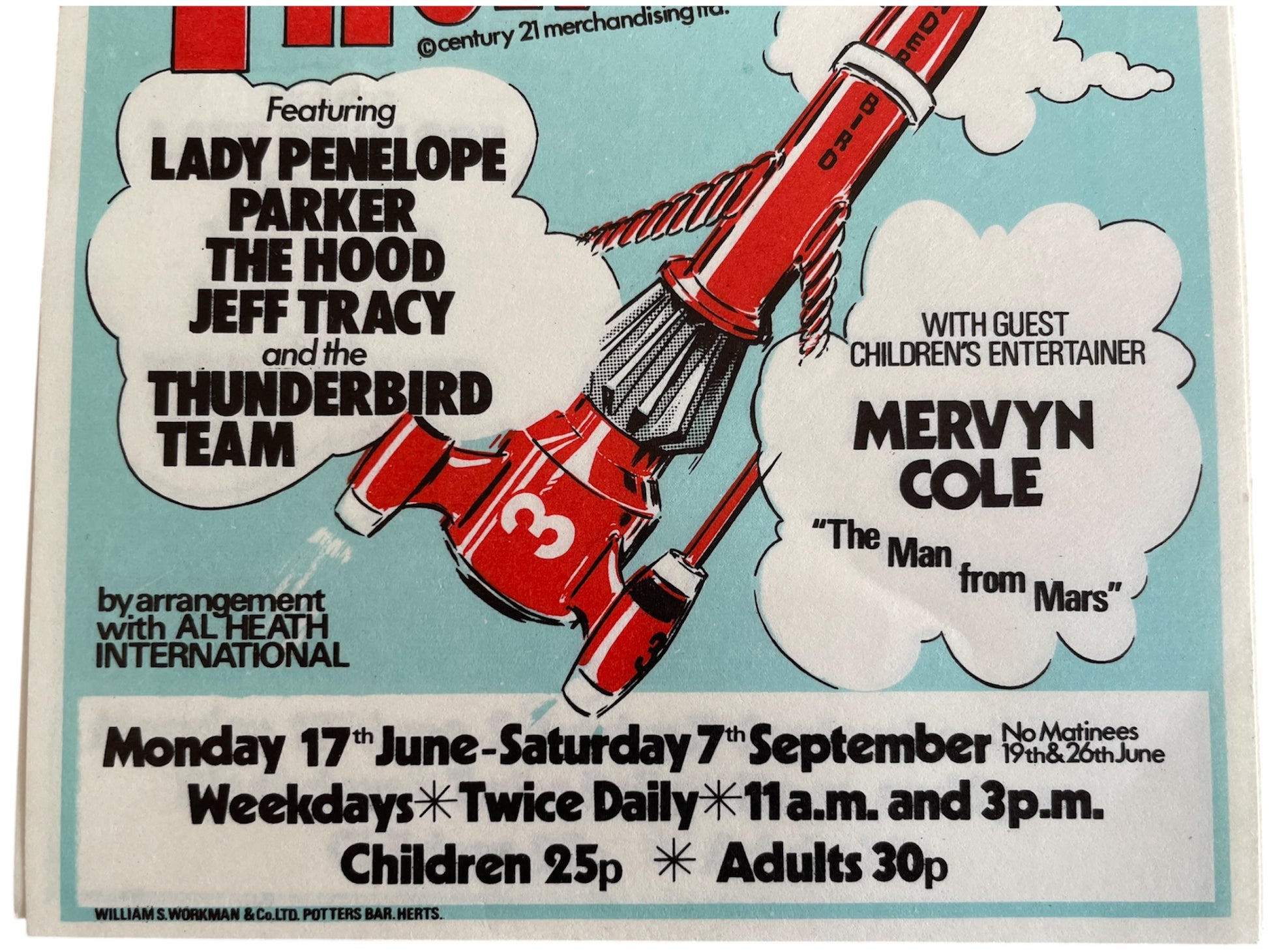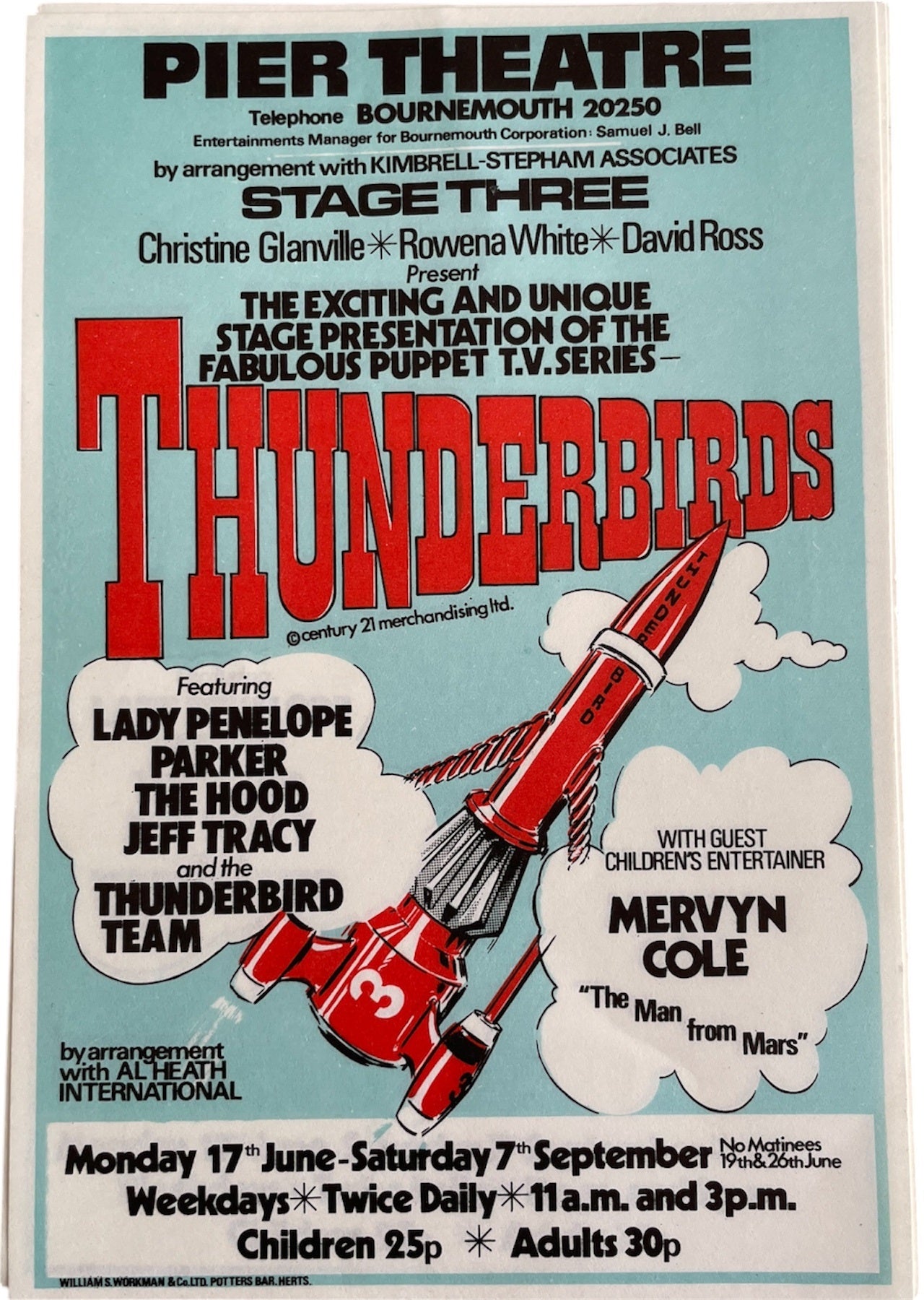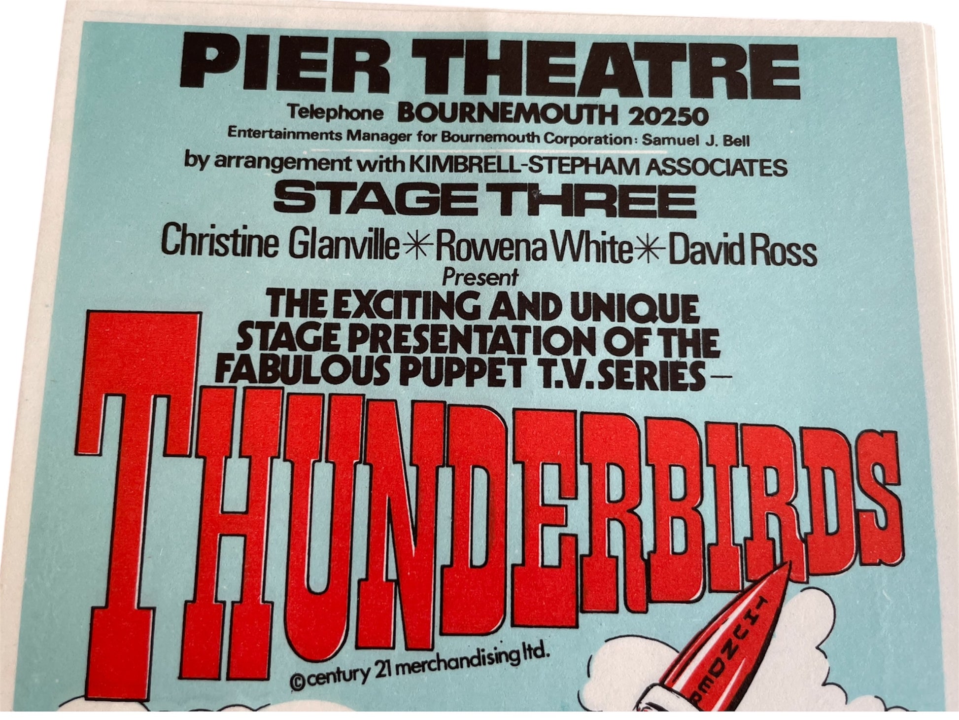 Vintage 1974 Gerry Andersons Thunderbirds Stage Presentation Of The Fabulous Puppet TV Series At The Pier Theatre In Bournemouth Advertising Flyer - Mint Condition Ex Shop Stock. This wonderful promotional flyer is an original unused flyer from 1974 which was never used due to the early cancellation of the stage show. The show was presented by "Stage Three" - Christine Glanville, Rowena White and David Ross. The puppets (rod puppet versions of the original TV series marionettes) were made by Christine Glanville and costumed by Rowena White, who also wrote the script. David Ross supervised the design and construction of the show's 16 stage sets and recorded the soundtrack. The show followed the successful format of Stage Three's Rupert Bear Show, in that the hour-long script was split into 4 separate scenes with a Comedy Magician providing some magical interludes between scenes and in this instance it was childrens entertainer Mervyn Cole. The voice of Lady Penelope was recorded for the Stage Show by Sylvia Anderson's daughter, Dee Anderson. Parker and Brains were voiced by Jimmy Jewel's son, Kerry Jewel and the other voices were recorded by Malcolm Storry and David Schofield. After its opening in Chelmsford, the show moved to the Woodville Halls in Gravesend, to great success and then to the Pier Theatre, Bournemouth for the main Summer Season, opening on 17th June 1974. Rather surprisingly, given the enormous popularity of the TV series, combined with the high quality and excellent reputation of Stage Three's productions, audience numbers for the Summer Season were very disappointing. Sadly, the Bournemouth season was curtailed after only completing the first month. Mint Condition Ex Shop Stock from a closed down comic book shop. All orders received before 4.00pm Monday to Fridays are shipped the same day.