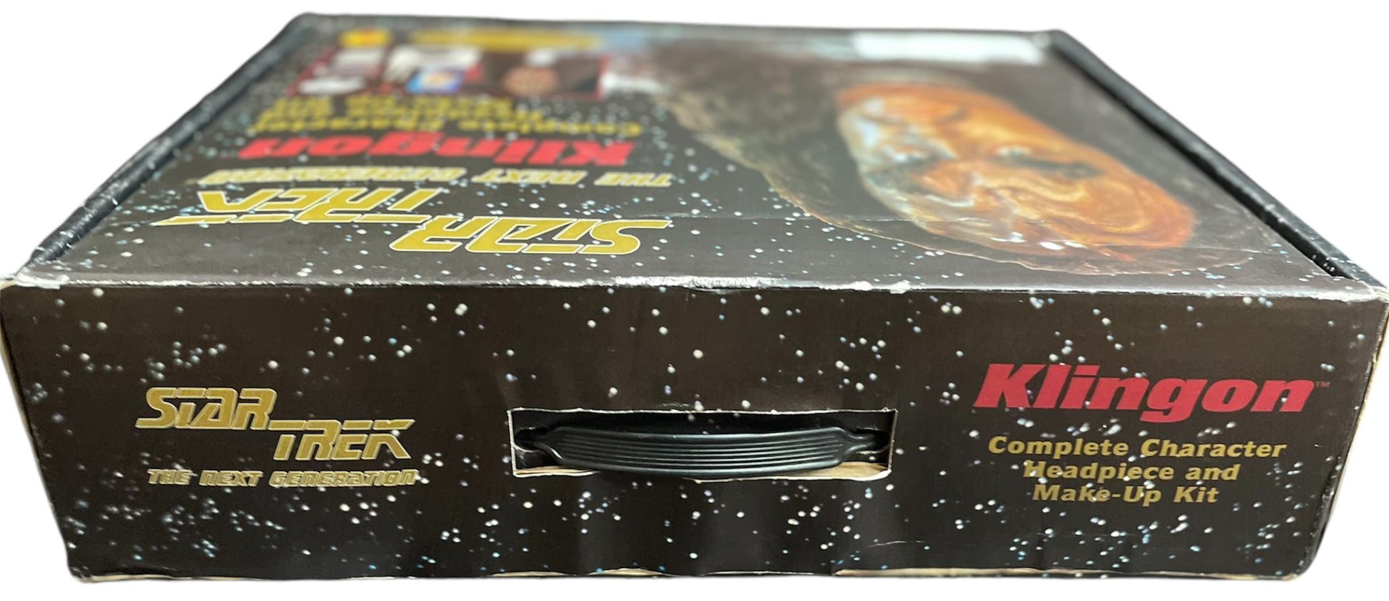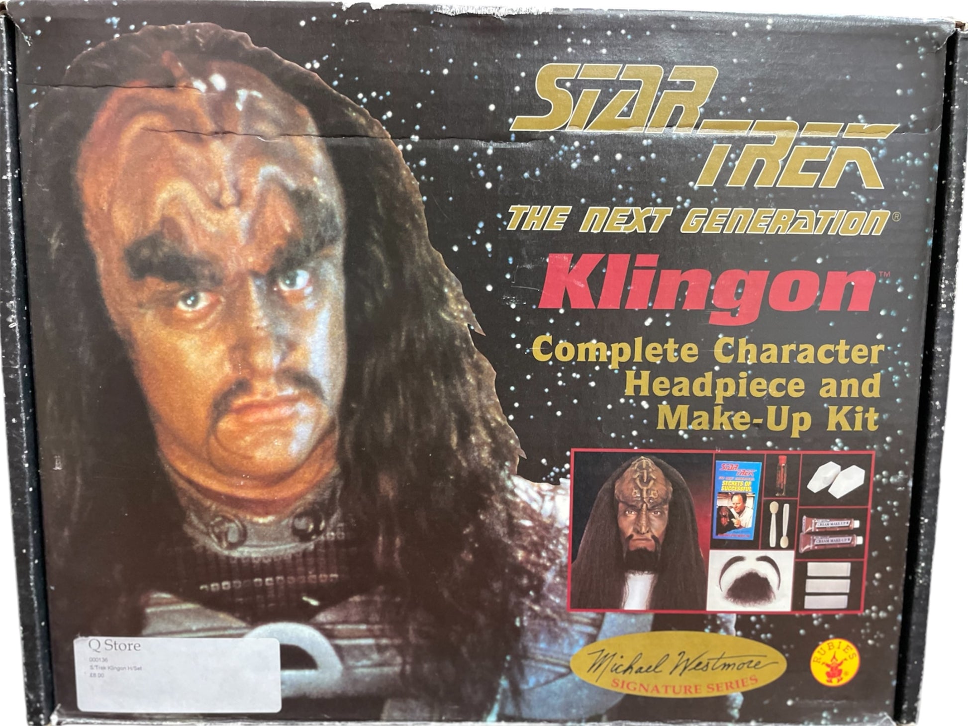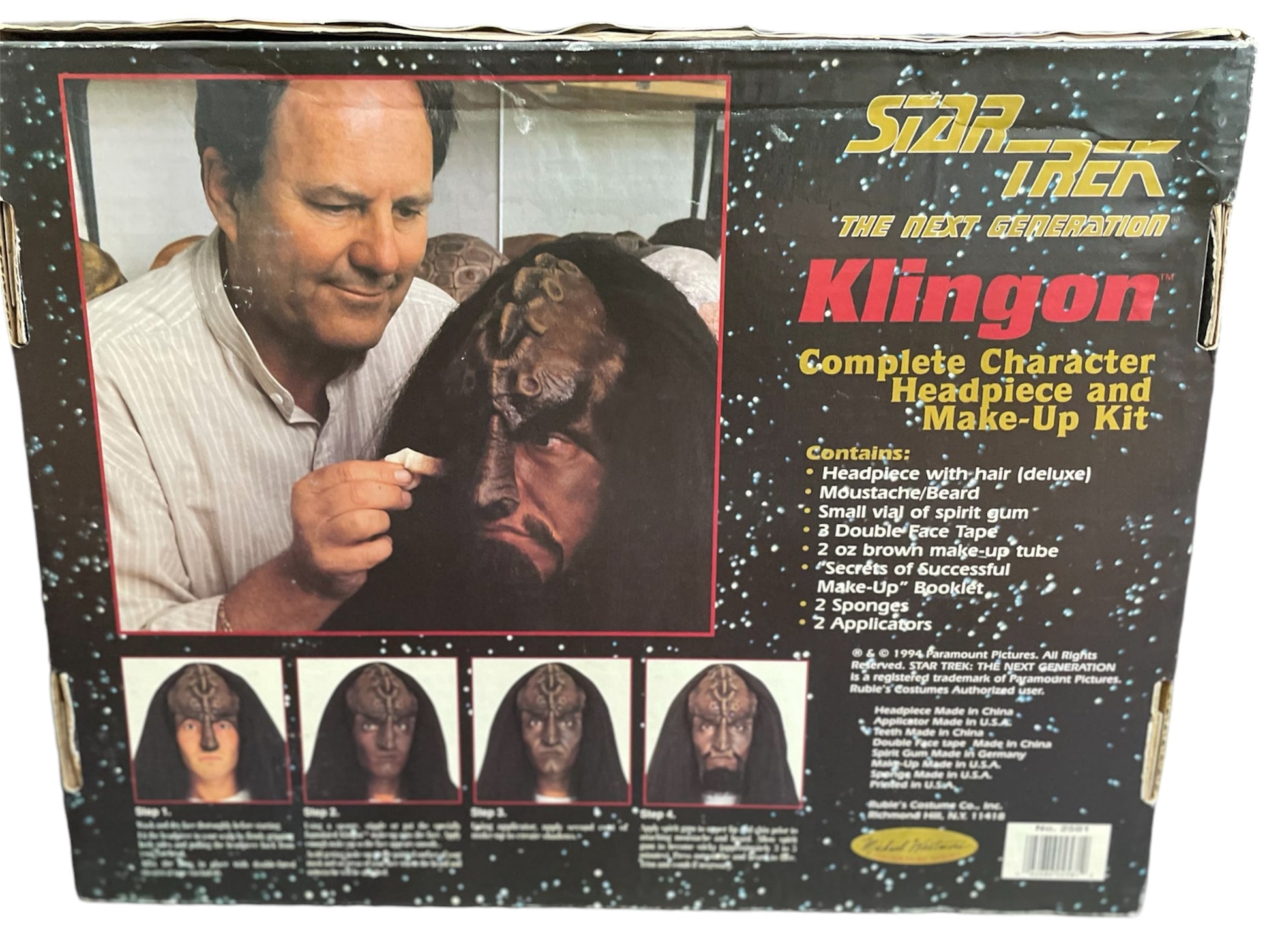 Vintage Rubies 1994 Star Trek The Next Generation Klingon Complete Character Headpiece And Make-Up Kit - Former Shop Counter Display Set. Released by Rubies in 1994 as part of their series of Star Trek The Next Generation Merchandise. This fantastic Klingon Complete Character Headpiece And Make-Up Kit contains everything you need to transform into a Klingon warrior and includes - Deluxe Headpiece With Hair, Moustache/Beard, Small Vial Of Spirit Gum, 3 Double Face Tape, 2 Oz Brown Make-Up Tube, Secrets Of Successful Make-Up Booklet, 2 x Sponges and 2 x Applicators. Former Shop Counter Display Piece, spend many months on display before being returned to the box and retired to the stock room for 30 years. Please note, due to age, some of the make-up may no longer be useable. Comes in the original box which is in superb condition with only minor signs of shelf wear along the edges. All Orders Received Before 4.00pm Mondays to Fridays are shipped the same day