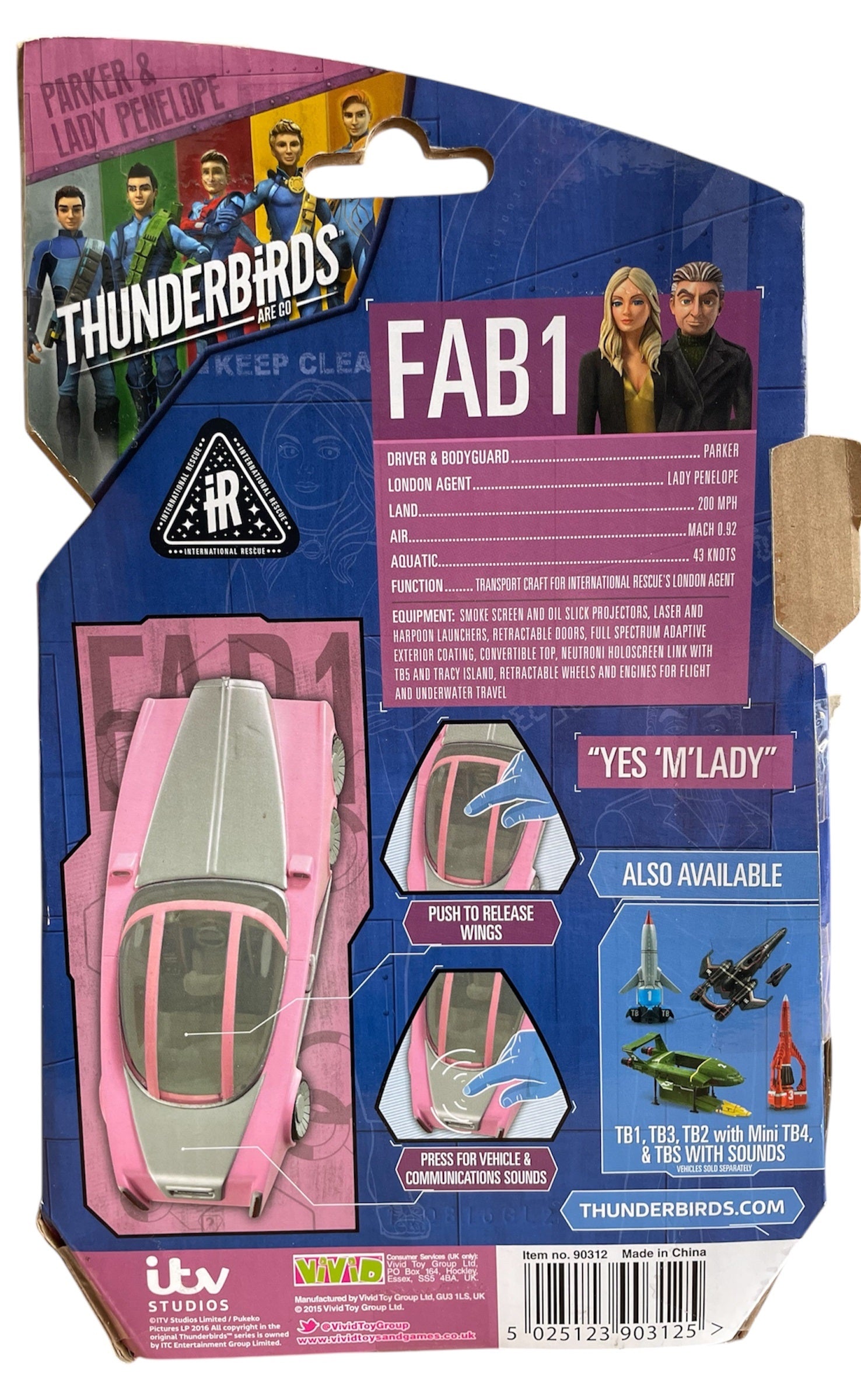 Vivid 2015 Gerry Andersons - Thunderbirds Are Go - Lady Penelope's FAB 1 Electronic Model Vehicle - Factory Sealed Shop Stock Room Find. Released by Vivid in 2015 in conjunction with the release of the reboot Thunderbirds Are Go Computer Animated TV Series. This fantastic Thunderbirds Are Go Electronic Model Vehicles features Lady Penelope's FAB1 Pink Rolls Royce, which measures 14cms long by 6cms wide by 3cms tall and is highly detailed and an detailed model of the one seen in the highly popular TV series with features that include - Opening And Retractable Wings, Vehicle and Communications Sounds and Free Rolling Wheels. Brand New Factory Sealed Shop Stock Room Find. Discovered in the store room of a closing down shop with a whole host of other items from a similar era. All orders received before 4.00pm Monday to Fridays are shipped the same day.